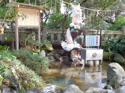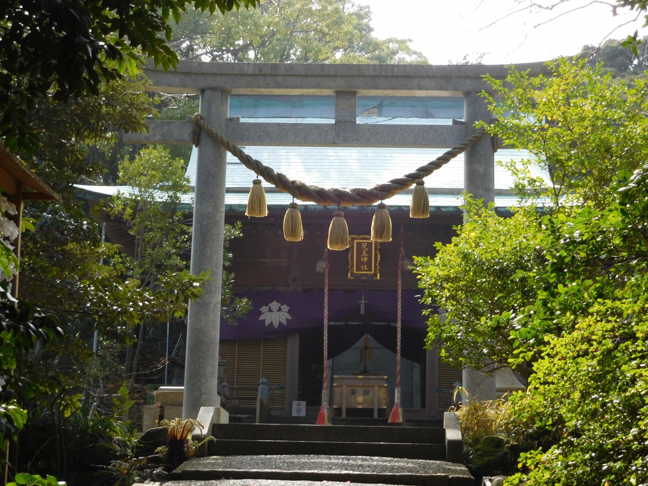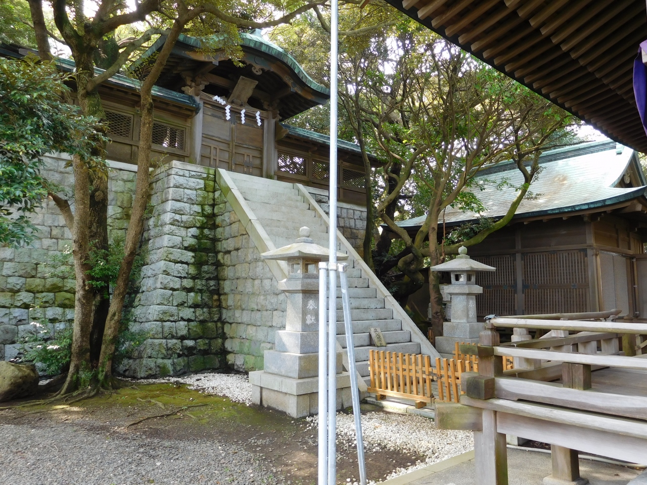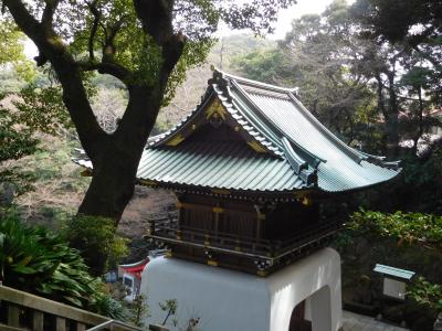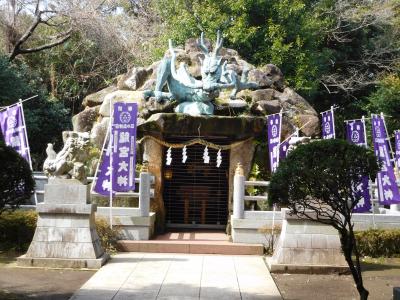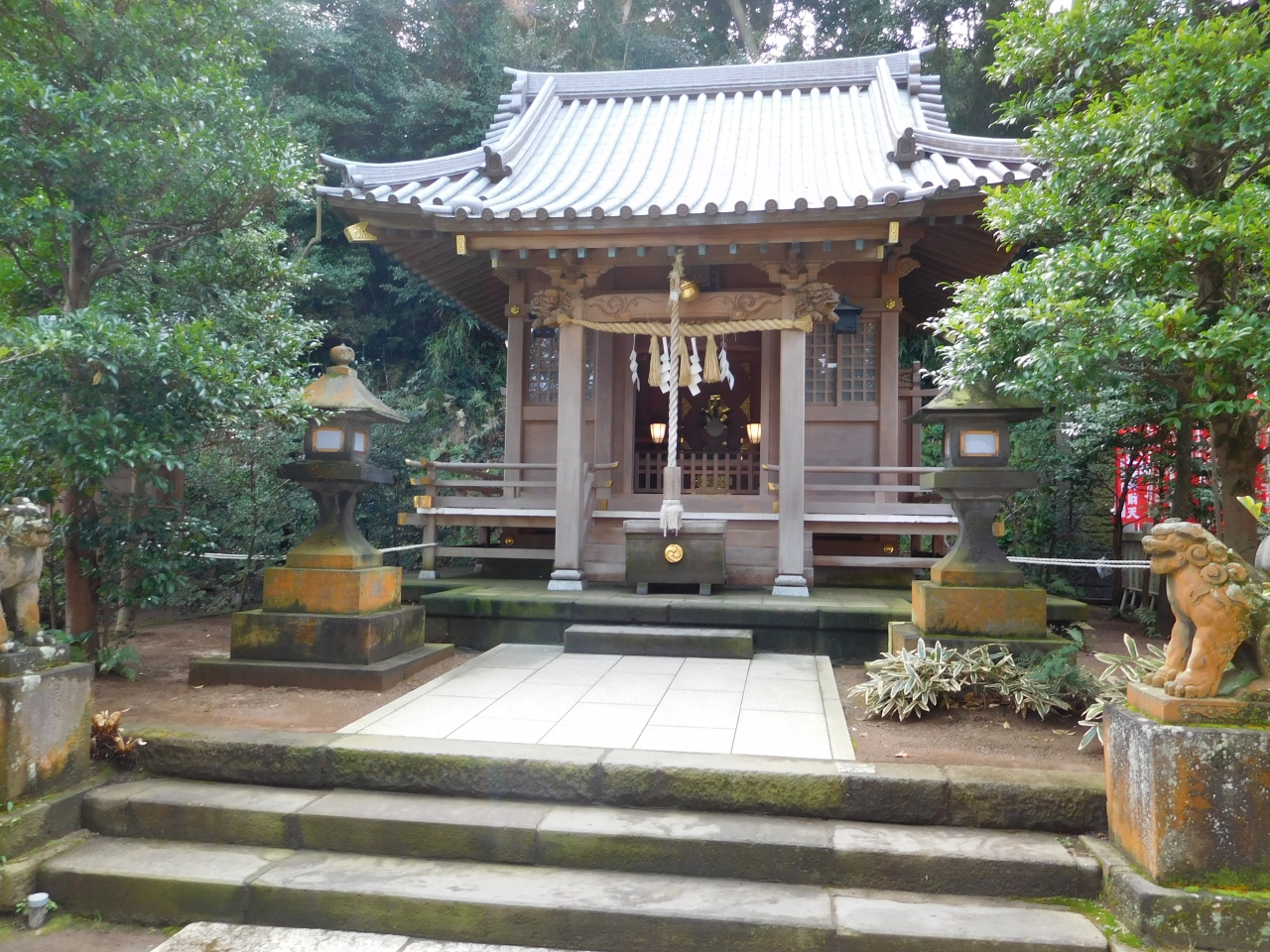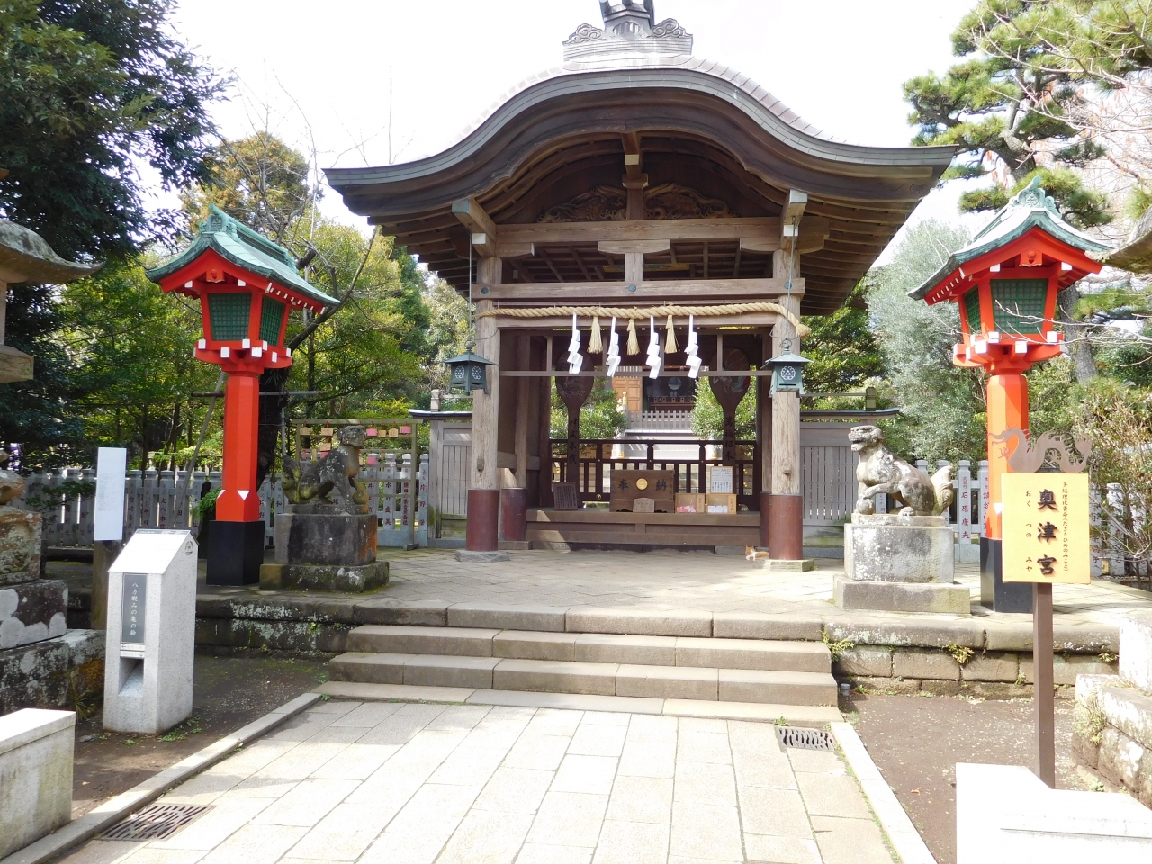 江島神社 辺津宮の境内にある、こじんまりとした小さな神社で、建速須佐之男命(たけはやすさのおのみこと)が祀られています。すぐ右隣には「奉安殿」があり、向かい側には、イチョウの御神木である「むすびの樹」があります。
