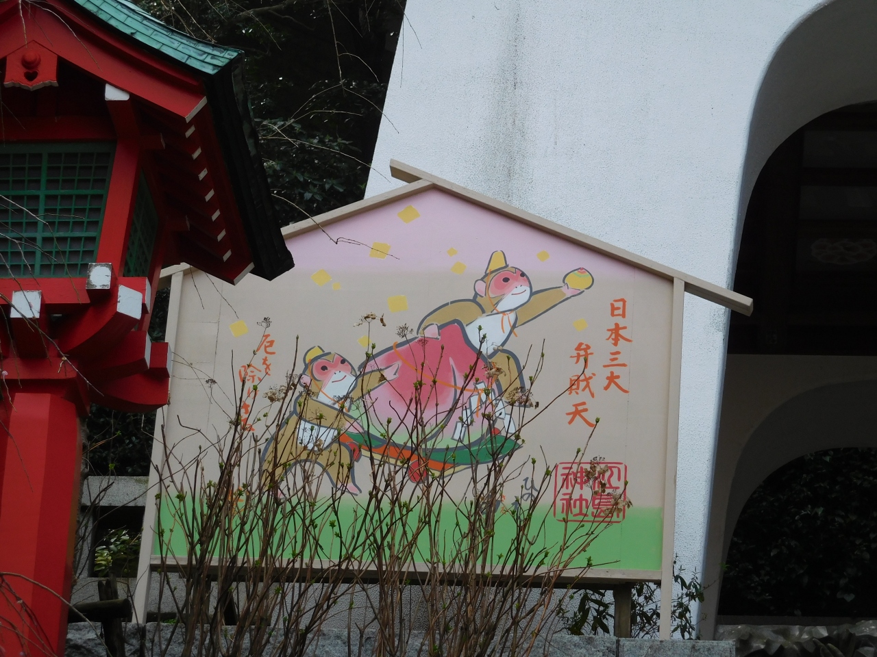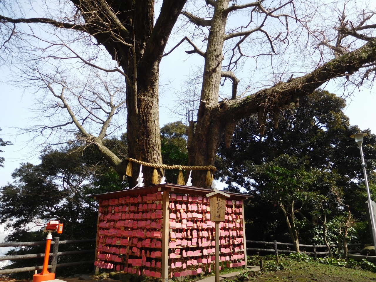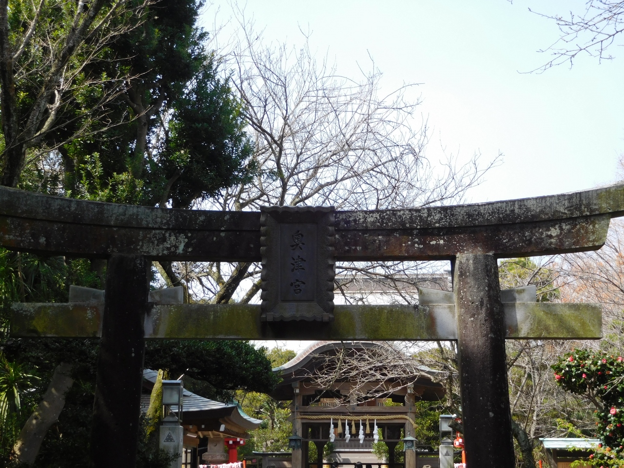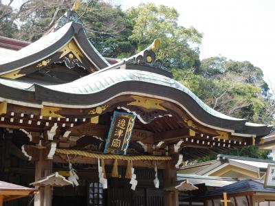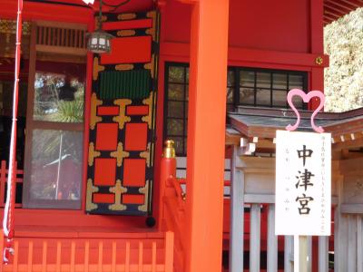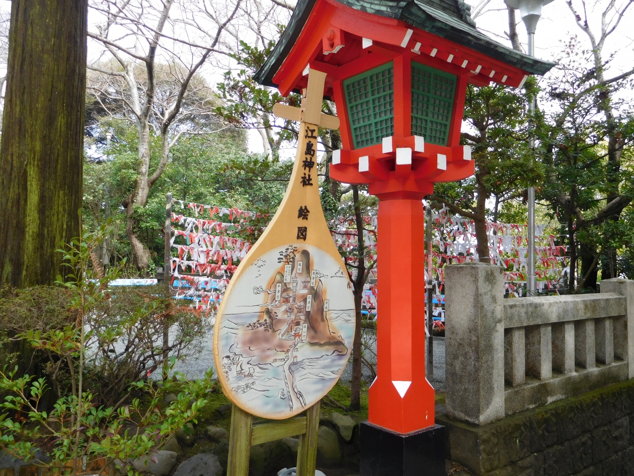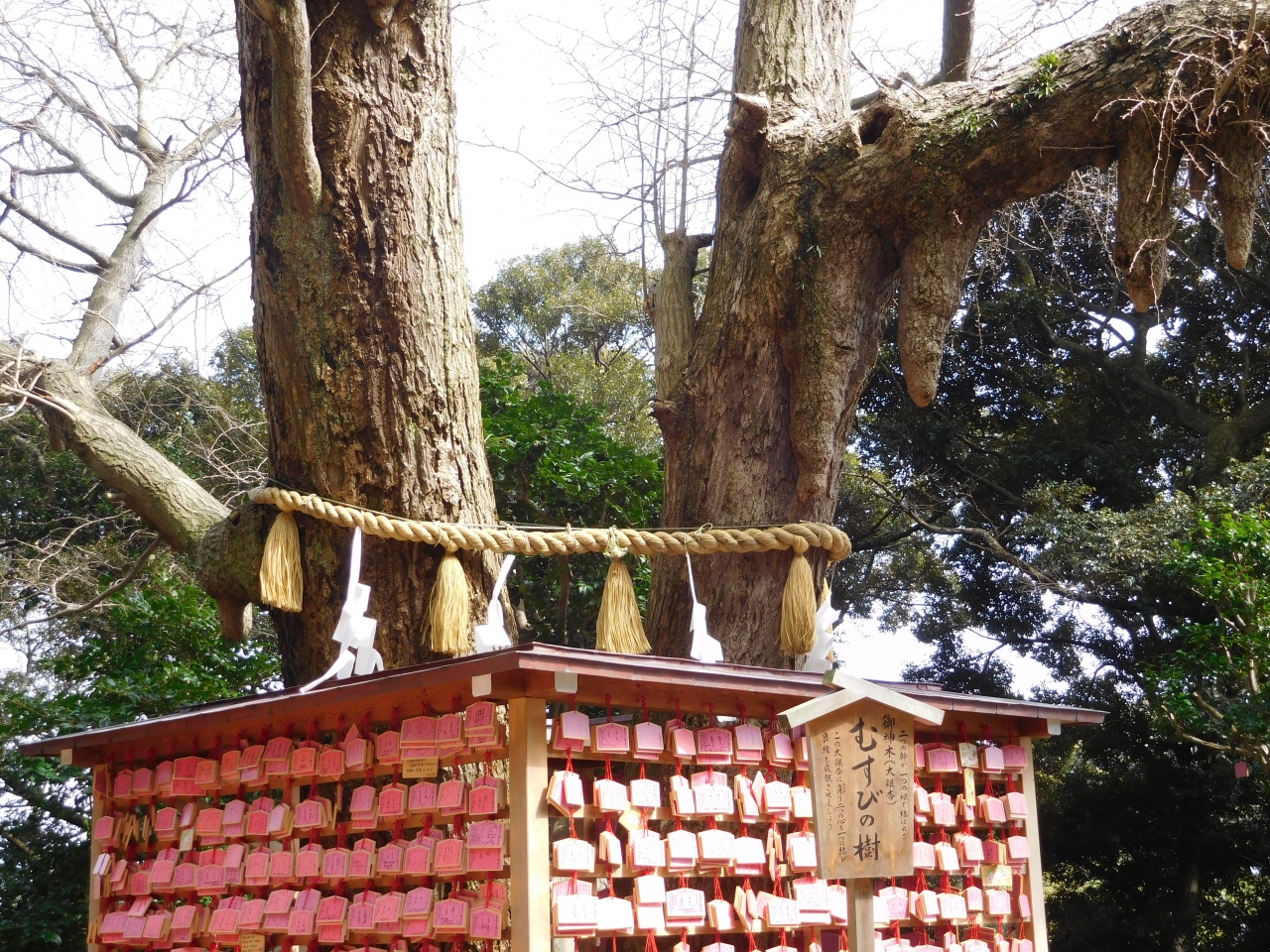 江島神社 辺津宮の境内にある、こじんまりとした小さな神社で、建速須佐之男命(たけはやすさのおのみこと)が祀られています。すぐ右隣には「奉安殿」があり、向かい側には、イチョウの御神木である「むすびの樹」があります。