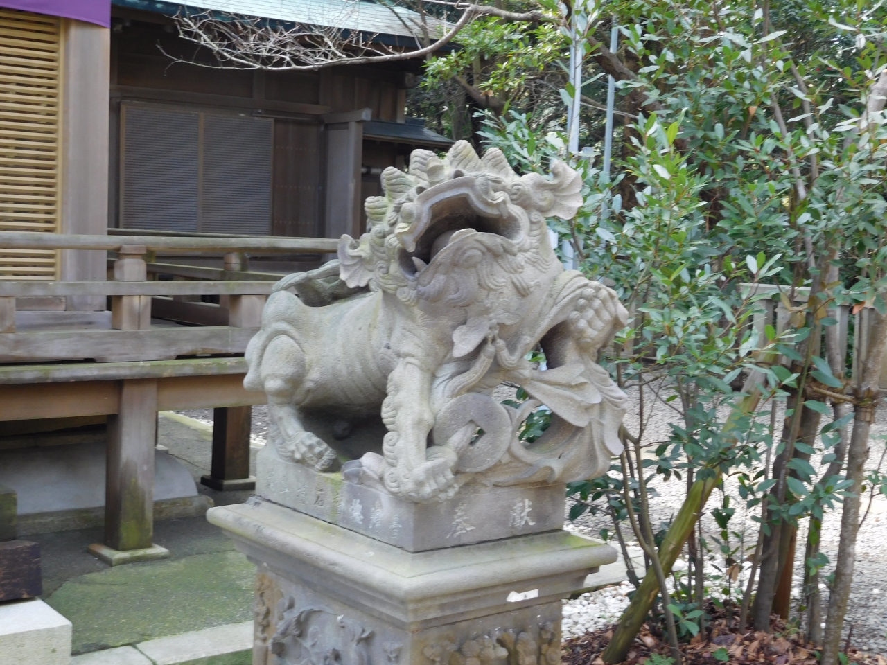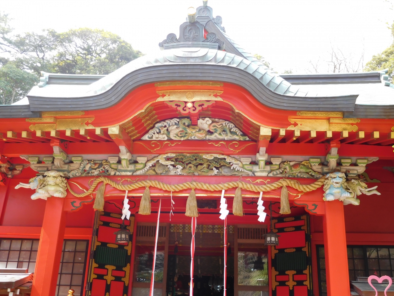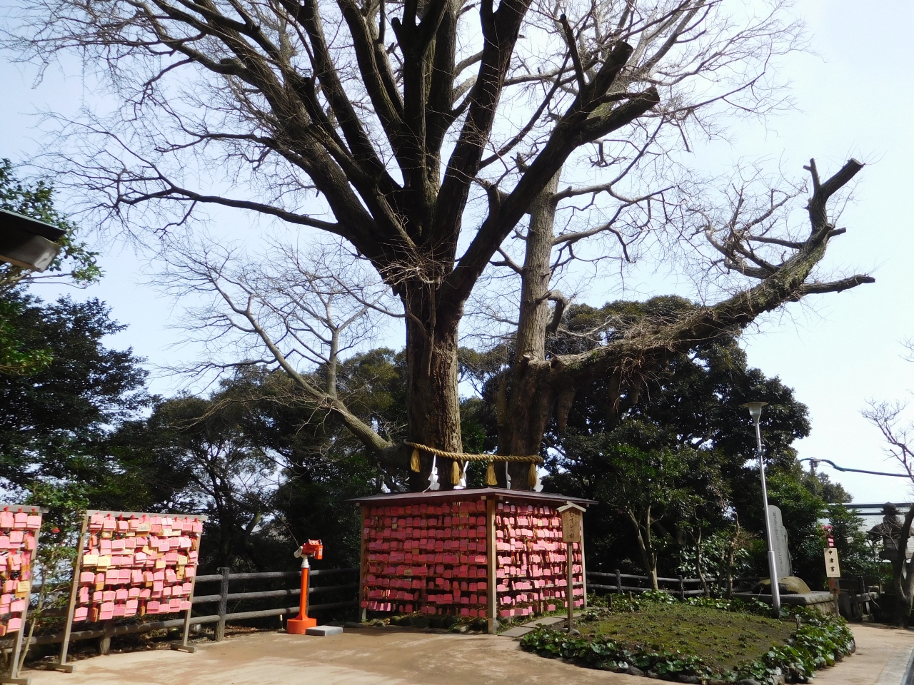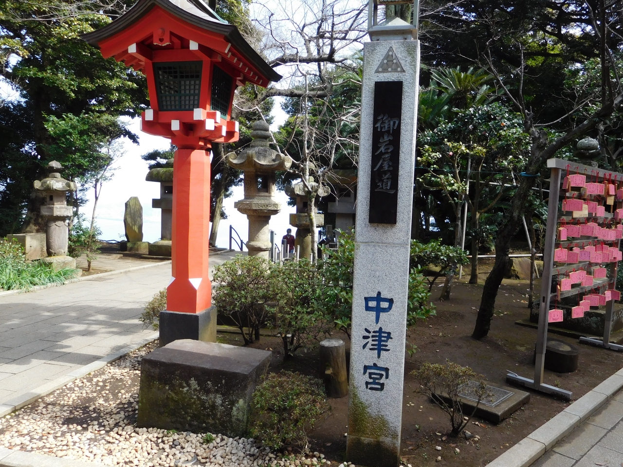 江島神社 辺津宮の境内にある、こじんまりとした小さな神社で、建速須佐之男命(たけはやすさのおのみこと)が祀られています。すぐ右隣には「奉安殿」があり、向かい側には、イチョウの御神木である「むすびの樹」があります。
