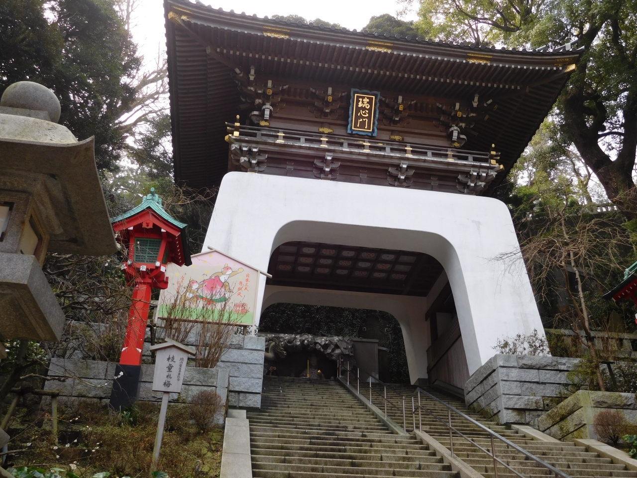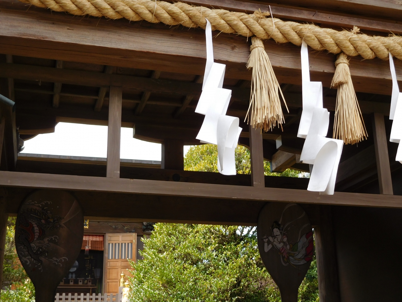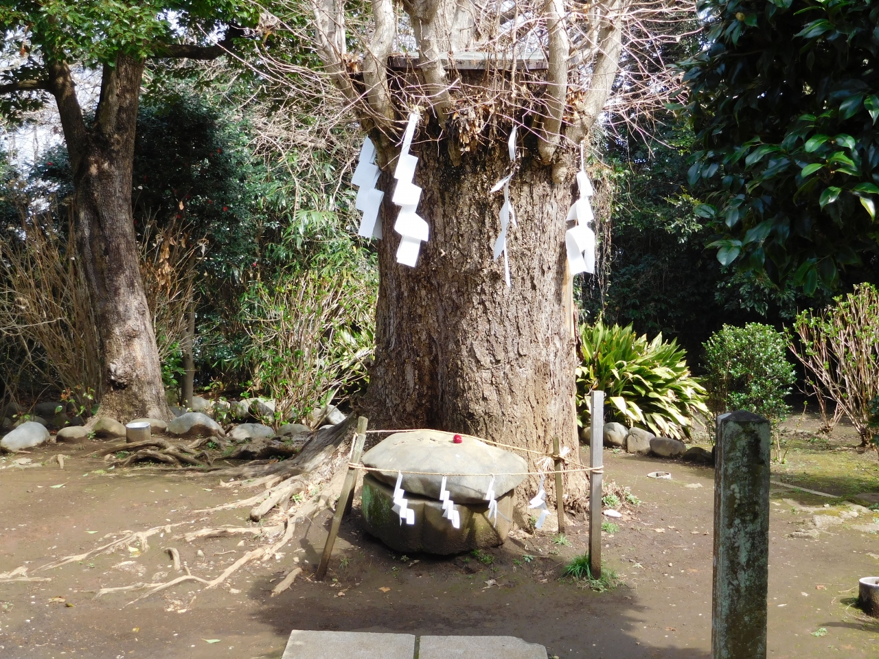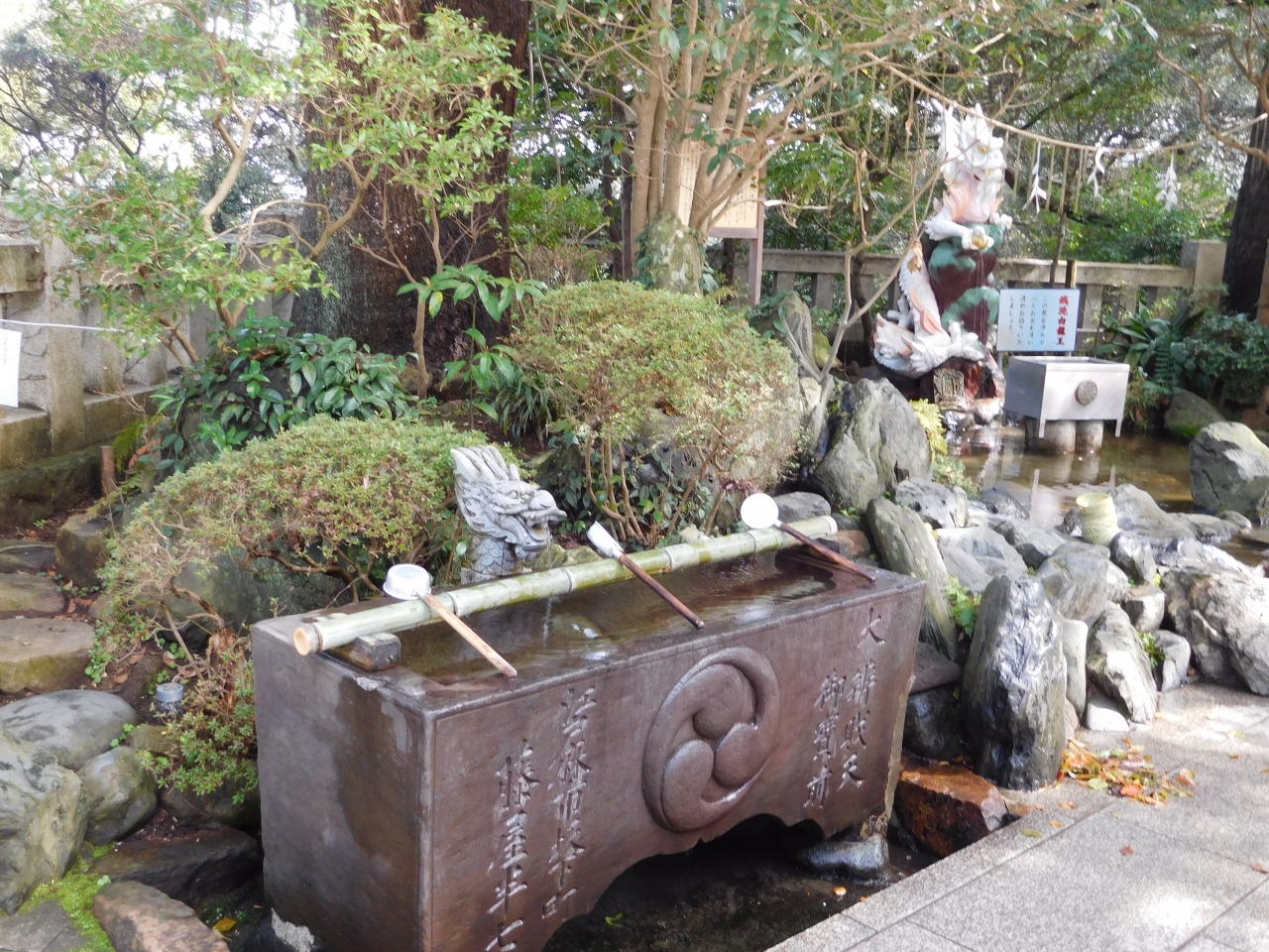 江島神社 辺津宮の境内にある、こじんまりとした小さな神社で、建速須佐之男命(たけはやすさのおのみこと)が祀られています。すぐ右隣には「奉安殿」があり、向かい側には、イチョウの御神木である「むすびの樹」があります。