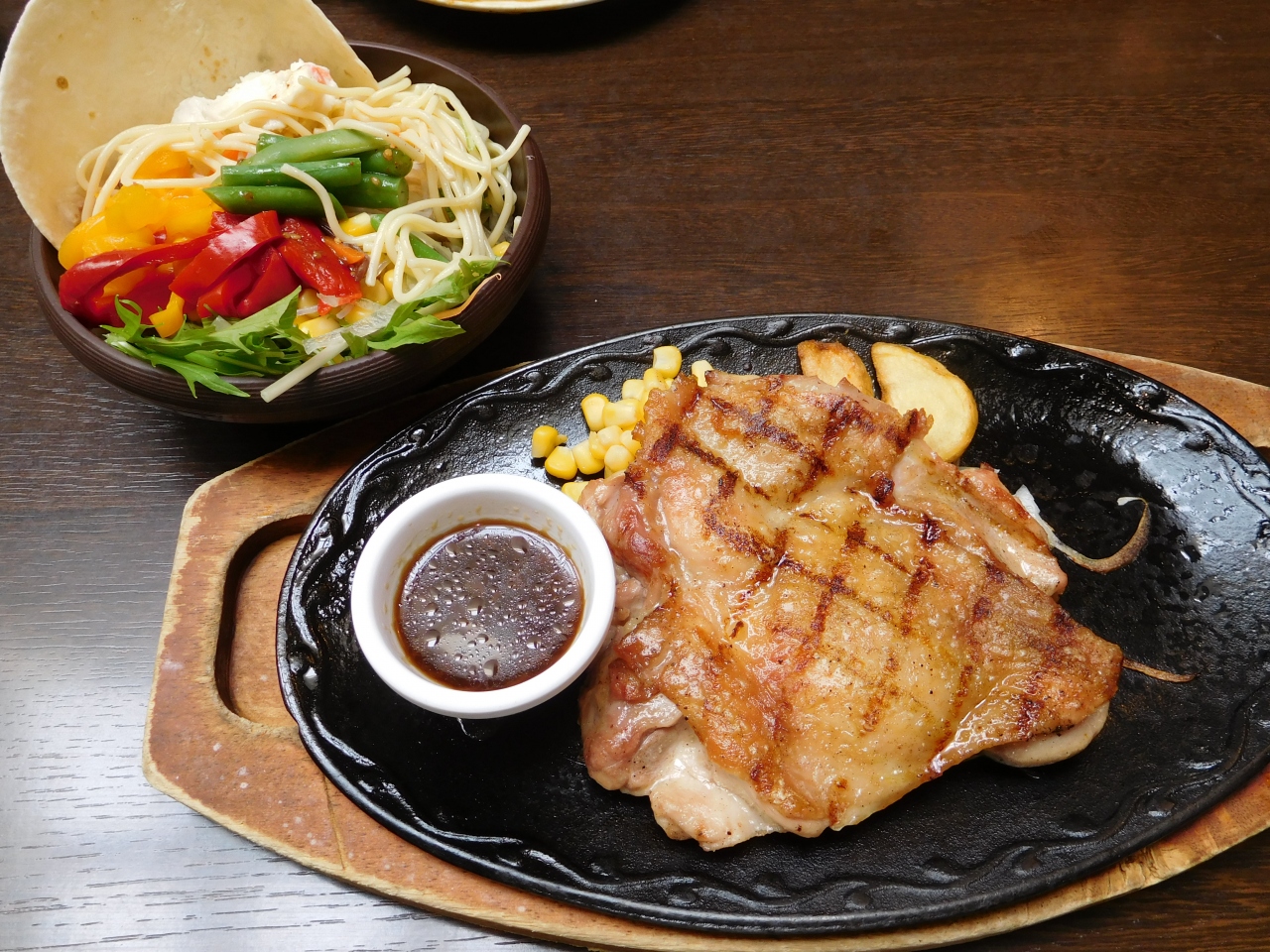 ステーキやハンバーグなど、メインメニューを注文すると、サラダバー、スープ(1種類)、ライス、カレーが食べ放題になります。ランチメニューは、月~土までしかやっていないようで、訪れた日曜日はランチの時間帯でも通常メニューのみでした。一番お得なグリルチキンを注文しましたが、ソースが4種類から選べて、なかなか美味しかったです。サラダバーも種類豊富で、果物が沢山置いてあったのが良かったです。ゆっくり美味しく食事が出来ました。