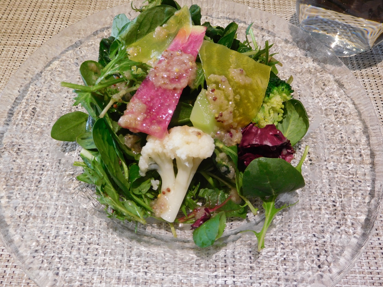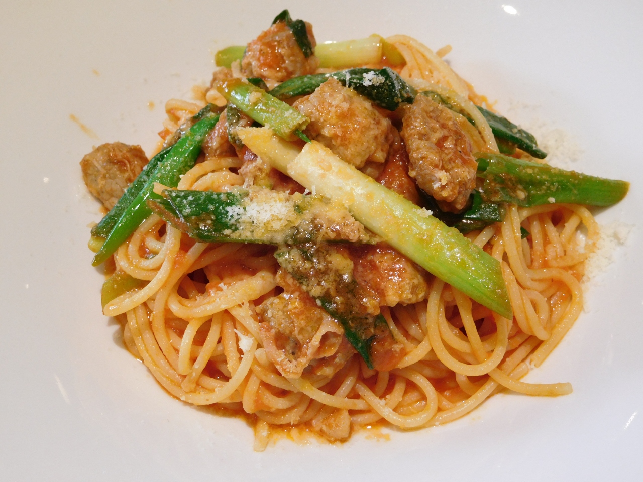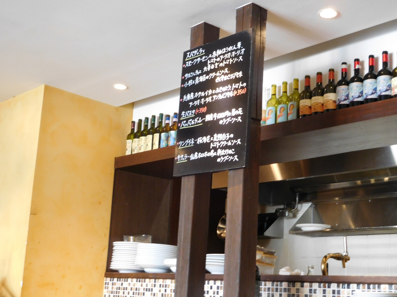 ランチメニューは2種類の値段設定があり、「Pranzo A 1400yen」の方を選びました。季節野菜のサラダ、パン、パスタ、ドリンクがついてきました。本日のメニューは、黒板に書かれていて、そこから選ぶようになっていました。見た目にも鮮やかで、美味しそうな盛り付けで料理が出て来ました。落ち着いた雰囲気のお店で、良かったです。また、予約の電話が結構掛かって来ていたので、常連のお客さんが多そうな感じでした。