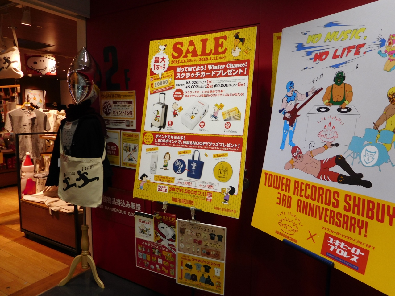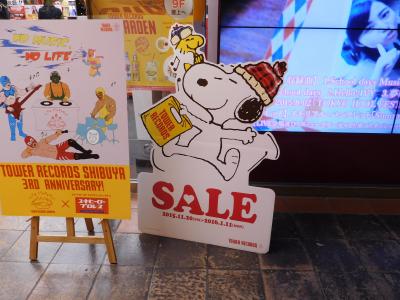 テレビを見ていたら、タワーレコードがスヌーピー(PEANUTS)とコラボしている情報が流れたので、久し振りに渋谷店に行ってみました。昔はよく輸入盤などを探しに行っていましたが、しばらくご無沙汰状態になっていたので、すっかり店内の様子が変わっていてビックリしました。でも相変わらず、音楽好きのツボを押さえたような店内のディスプレイや配置になっているな、と思いました。2階のカフェ付近には、タワレコとコラボしたデザインのグッズが沢山並んでいました。SALEのデザインもスヌーピー柄で、思わずワクワクしてしまうような店内で嬉しかったです。