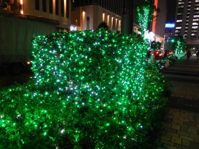 有楽町駅前のイルミネーションです。駅周辺の街路樹や植え込みが、グリーン一色のイルミネーションで輝いていました。東京交通会館のホワイトを基調としたイルミネーションと合わせてみると、綺麗でした。グリーン一色のイルミネーションは、なかなか見ないので、珍しいなと思いました。