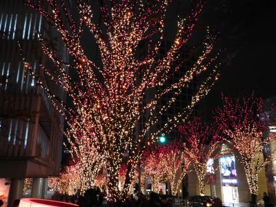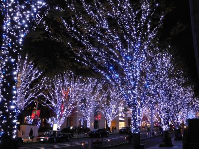 約400メートルの並木が続くけやき坂は、クリスマスイルミネーションの時期になると幻想的な世界となります。白と青のLEDによる「SNOW & BLUE」と、赤やキャンドル色のLEDによる「CANDLE & RED」の2種類のイルミネーションがあり、毎時00分~10分は赤色、10分~30分は青色、30分~40分は赤色、40分~00分までは青色のイルミネーションが楽しめます。坂の正面には東京タワーも見え、とても見応えがありました。