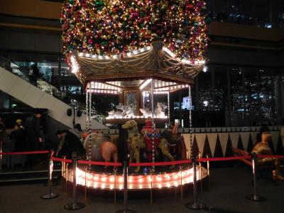 東京 丸の内エリアの6施設とコラボして、クリスマスの装飾がされていました。2015年のテーマは、サンタの国の不思議なサーカス団「Christmas Circus」で、クリスマスリースやツリーのデコレーションがされた、愉快なサーカスの一団がありました。丸ビルでは、羽生くんのスケートリンクと、サーカス団が楽しんでいるメリーゴーランドの上にクリスマスツリーがありました。