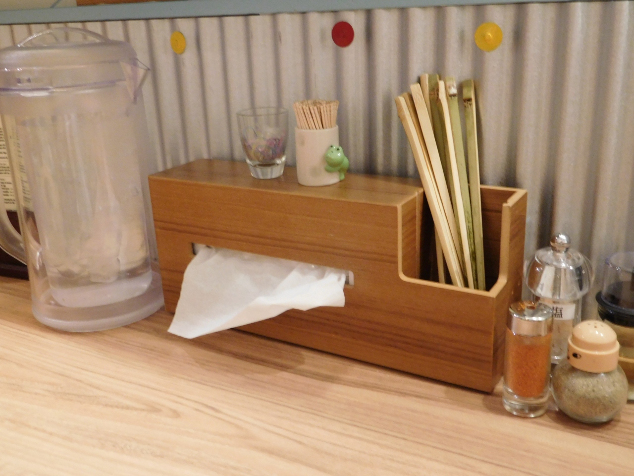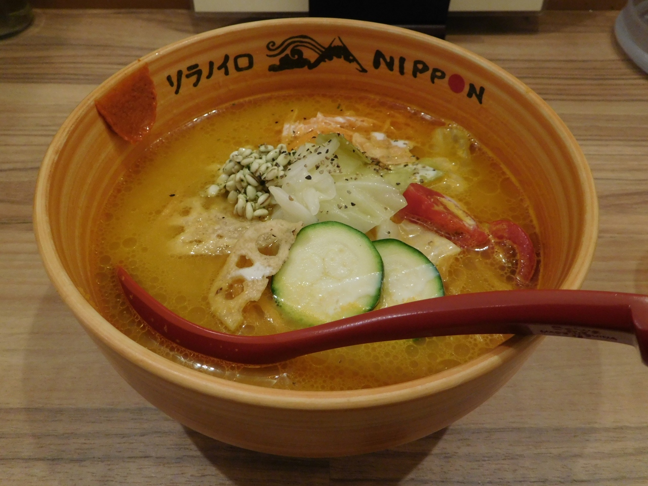 ラーメンストリートがリニューアルオープンした際、このお店の看板メニューである「ベジソバ」がTVで紹介されていたので、気になって食べに行ってきました。先に食券を買い、席に案内してもらいました。個性的なイスのデザインだったり、遊び心あふれる内装だったり、なかなかいい雰囲気のお店でした。ベジソバは、パプリカを練り込んだ麺に、野菜がたっぷり入っていて、スープも旨味がたっぷりしていて、美味しかったです。