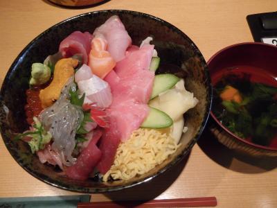 ランドマークの5階にある、静岡県を中心にチェーン展開している「沼津魚がし鮨」のお店です。下のフロアのレストランに比べると、ちょっとお値段が高め設定なので、お昼時でも待たずに座れました。休日限定のランチメニューもありましたが、「海鮮ちらし丼」と「極上ちらし丼」を注文しました。大きなネタが載っていて、ご飯も程良い量でした。お昼にしてはちょっと贅沢な値段でしたが、美味しかったです。