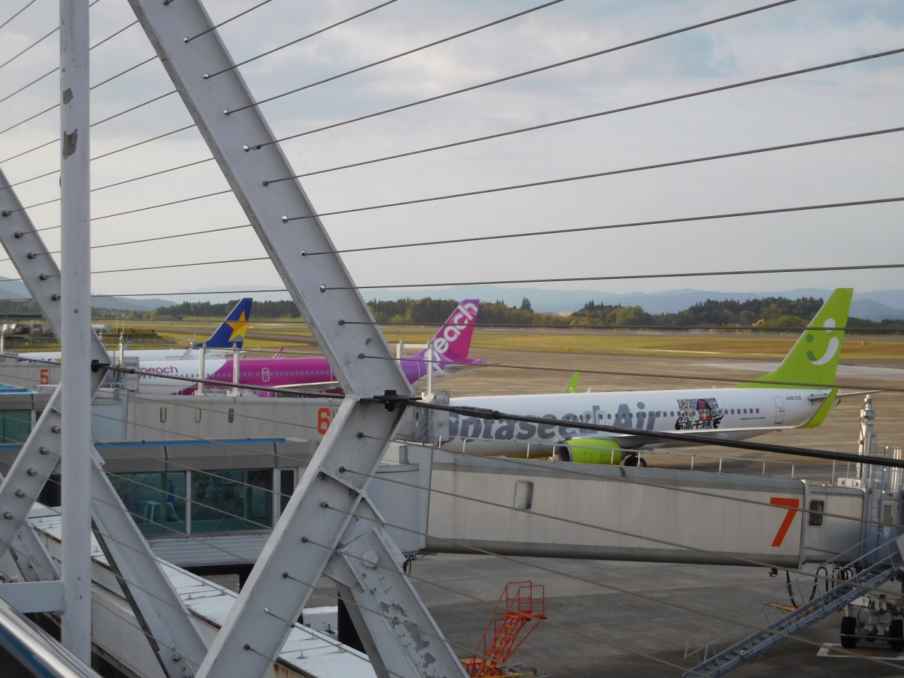 鹿児島空港3階にある展望デッキです。霧島の山々を背景に、ソラシドエア、ピーチ、スカイマークと、カラフルな機体の航空機が並んでいるのを見る事が出来ました。レストラン街と同じフロアにあるので、気軽に外に出て眺められるようになっていました。また、南側には無料で見学できる「SORA STAGE」の出入口があるので、こちらの見学もおススメです。