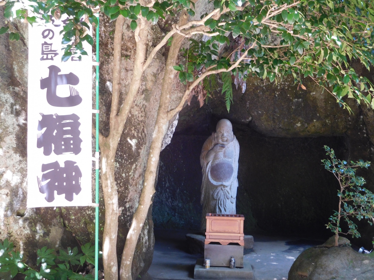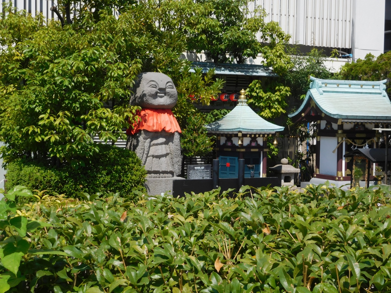 「銀座三越」の9階にある、無料で開放されている広場「銀座テラス」の少し奥まった場所にあります。緑が生い茂った場所に、穏やかな顔をしているお地蔵様がいました。真夏の暑い日でしたが、熱心にお参りをしているサラリーマンの方がいました。あまり知られていない感じなので、知る人ぞ知る銀座のパワースポットだと思いました。
