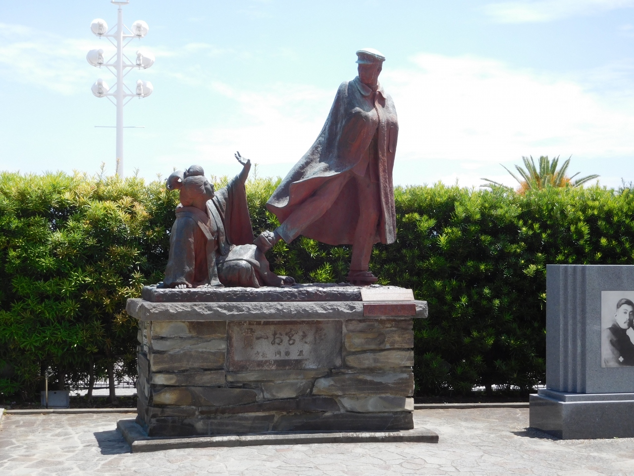 熱海サンビーチ近くの国道135号線沿いにある、松の木と銅像です。以前、国道の信号待ちをしている時に見かけて気になっていて、今回は熱海サンビーチ近くを散策している際、見に来る事が出来ました。尾崎紅葉の小説「金色夜叉」の舞台になっている為、この銅像が設置されているようでした。