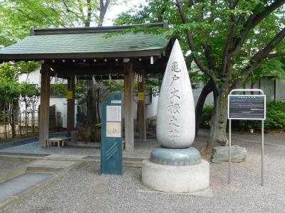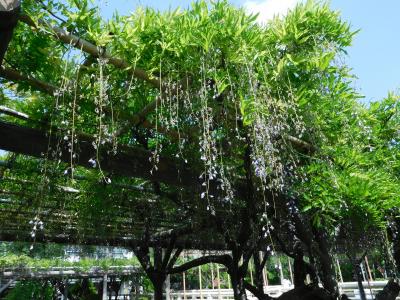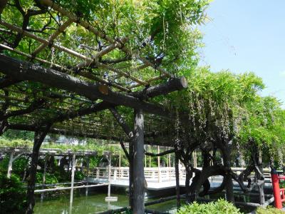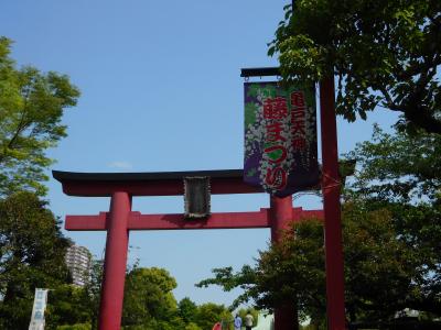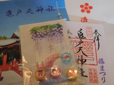 東京十社の一つ、江東区にある「亀戸天神社」の藤まつりは、2021年は4月17日~5月5日開催でした。丁度この期間中に行く事が出来ましたが、今年は藤の花の開花と見頃が例年よりも早まってしまったようで、かろうじて一部紫色の藤の花が残っている位で、ほとんどが青々とした藤棚になってしまっていました。池を囲むようにして藤棚が広がっているので、タイミングが合えば、とても綺麗な景色が見れるだろうと思いましたが、自然の花々は、なかなかタイミングを合わせて訪れるのが難しいなと思いました。御朱印は「藤まつり」の文字が入ったのを頂く事が出来ました。