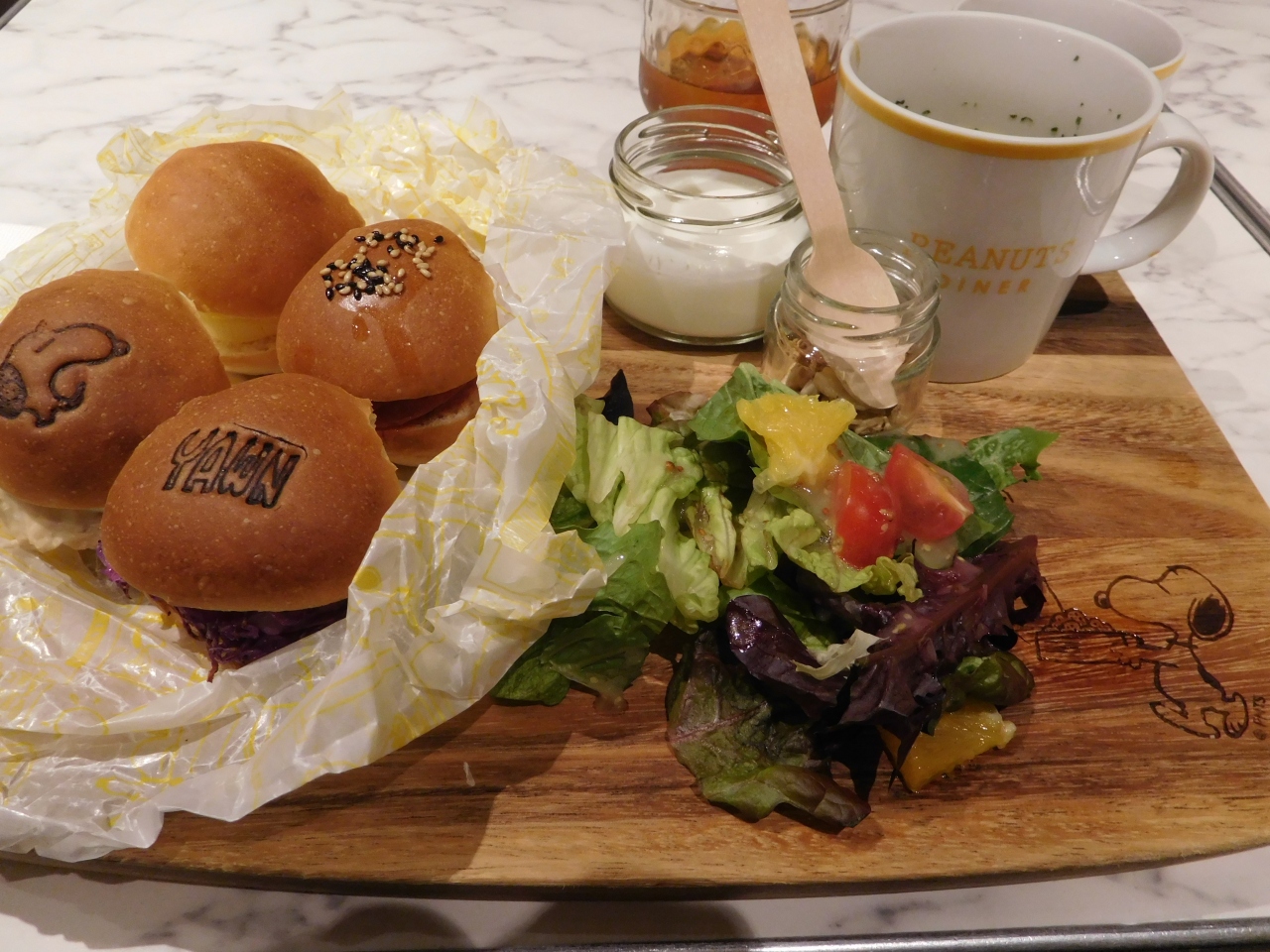 PEANUTS HOTELの3階にあるレストランで、ホテル宿泊者はこのレストランが朝食会場になります。4種類のミニハンバーガー、サラダ、ヨーグルトがワンプレートになっていて、スープとドリンクが付いてきました。店内は、ピーナッツの世界観が楽しめるようになっていて、思わず写真に撮りたくなるような工夫がいろいろとされていました。スヌーピー好きにはおススメの場所だと思います。
