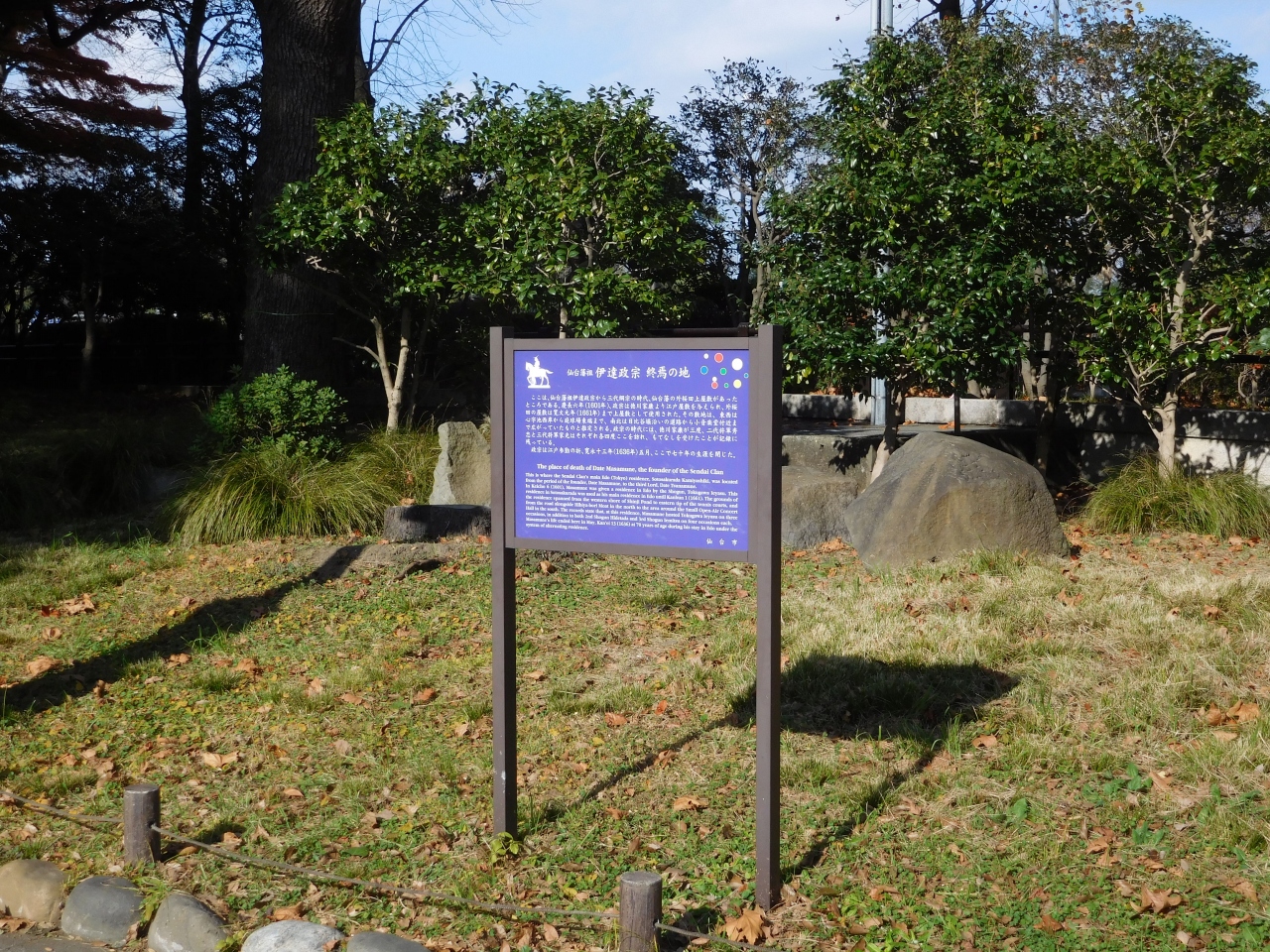 皇居に近い方の公園入口(有楽門)から入って、そのまま真っ直ぐに進んだ辺りに、紫色に白字で書かれた「伊達政宗終焉の地」という案内板がありました。仙台藩祖の伊達政宗がこの地で70年の生涯を閉じたという事実は意外でした。