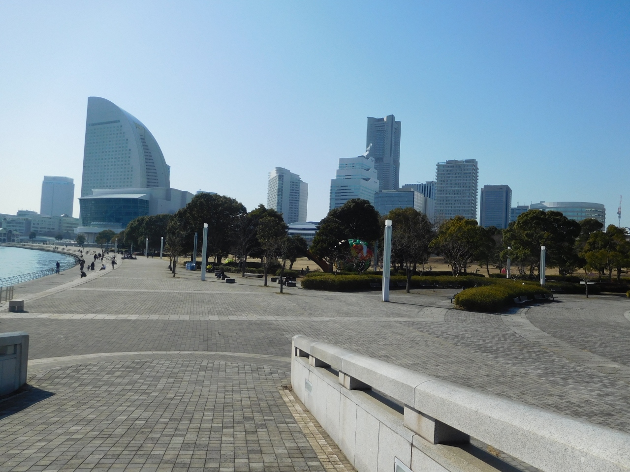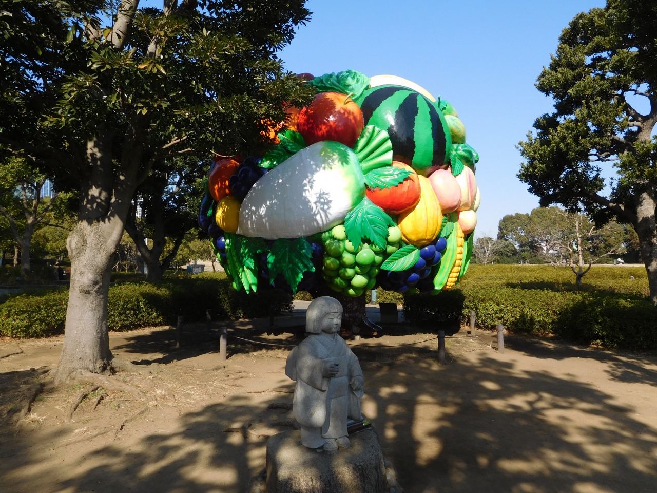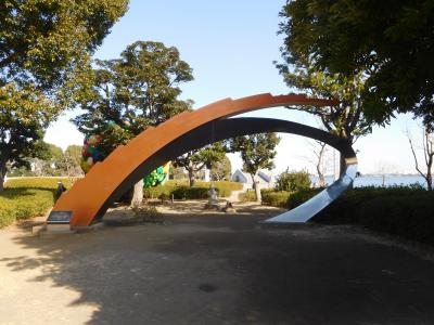 横浜港に面した「臨港パーク」の一角、木に囲まれた場所に、虹をイメージしたオブジェがあります。「日本ブラジル修好100周年記念」のモニュメントで、海に向かって、オレンジ色と銀色の2種類の虹が出ているような感じでした。すぐ近くには、「フルーツツリー」や、「リマちゃんと握手」のオブジェもありました。