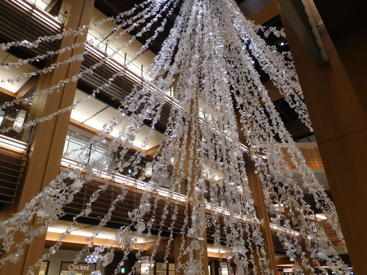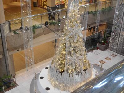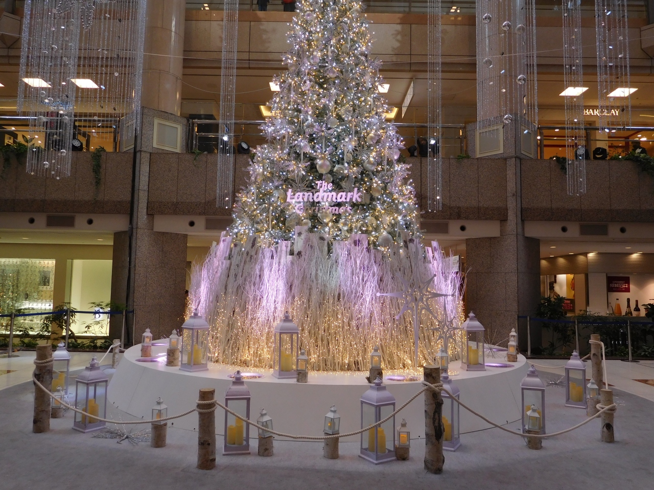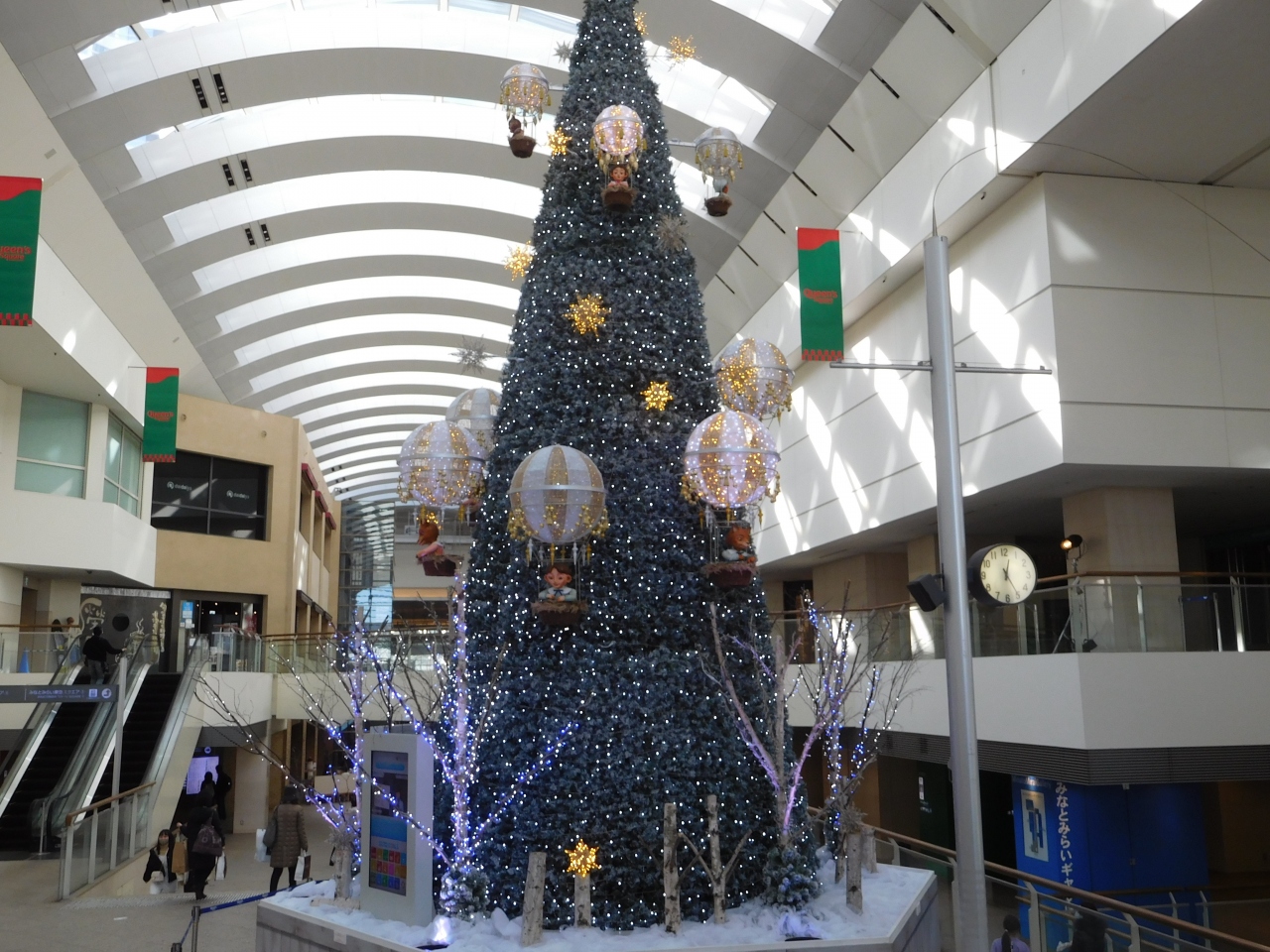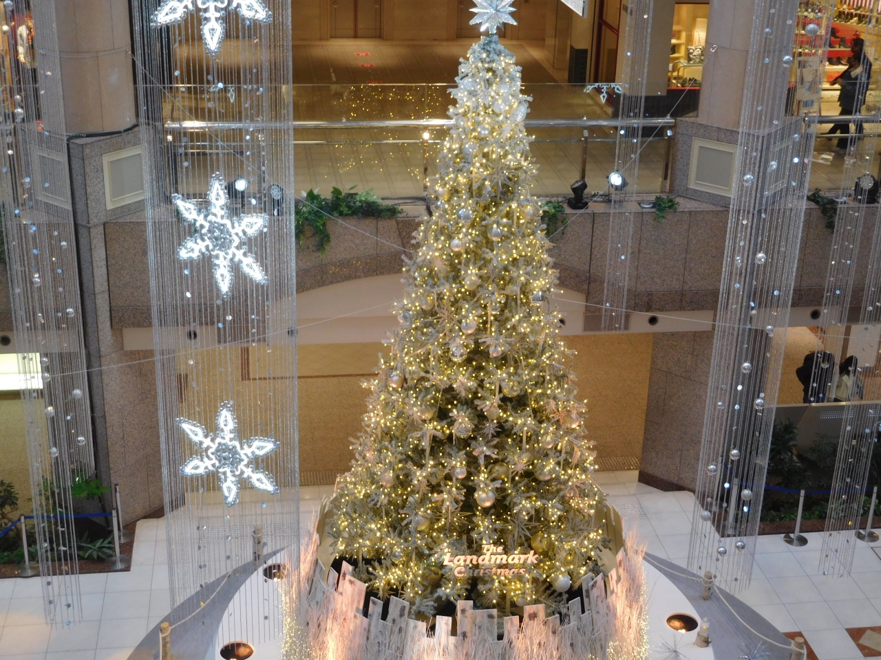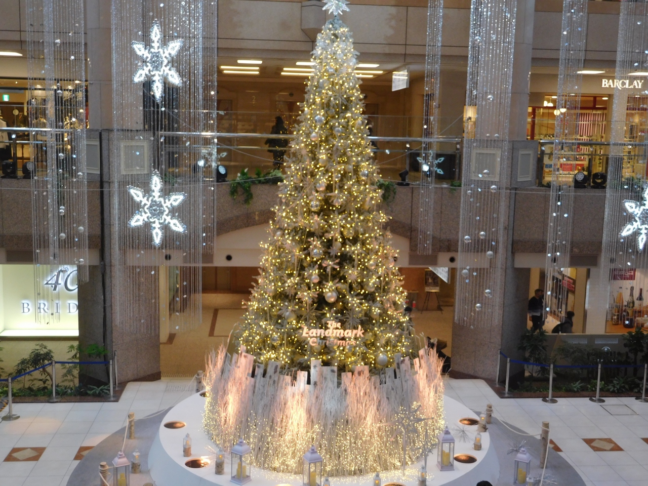 横浜のみなとみらいにある「横浜ランドマークプラザ」の大きな吹き抜け部分に、ホワイトクリスマスツリーが設置されていました。ツリーの両側には、雪が降っているような演出がされ、白樺の木でロープが張られていたり、ランタンが置いてあったり、まるで北欧のような雰囲気の上品なクリスマスツリーでした。上の階からや、階段の途中、1階の正面など、様々な角度からクリスマスツリーを楽しむ事が出来て良かったです。