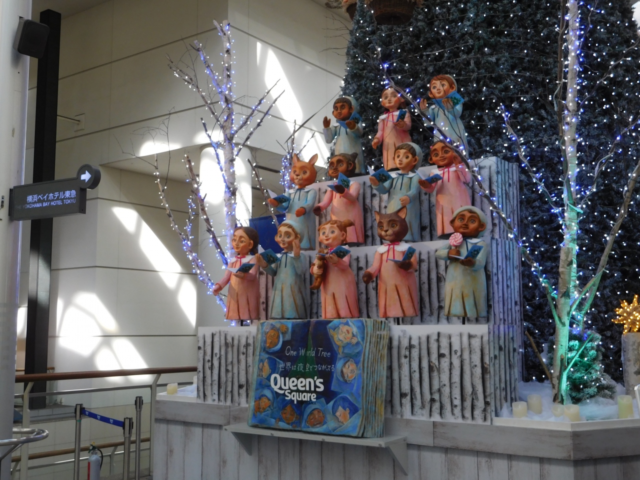 みなとみらい線「みなとみらい駅」から直結した商業施設「クイーンズスクエア横浜」の1階にクリスマスツリーが設置されていました。2020年のテーマは、「One World Tree~世界は夜空でつながってる~」で、ちょっと不思議な感じのする世界観のお人形さん達が飾られていました。ちょうど階段のある場所に設置されているので、その角度を利用して写真を撮る事が出来たりして、良かったです。