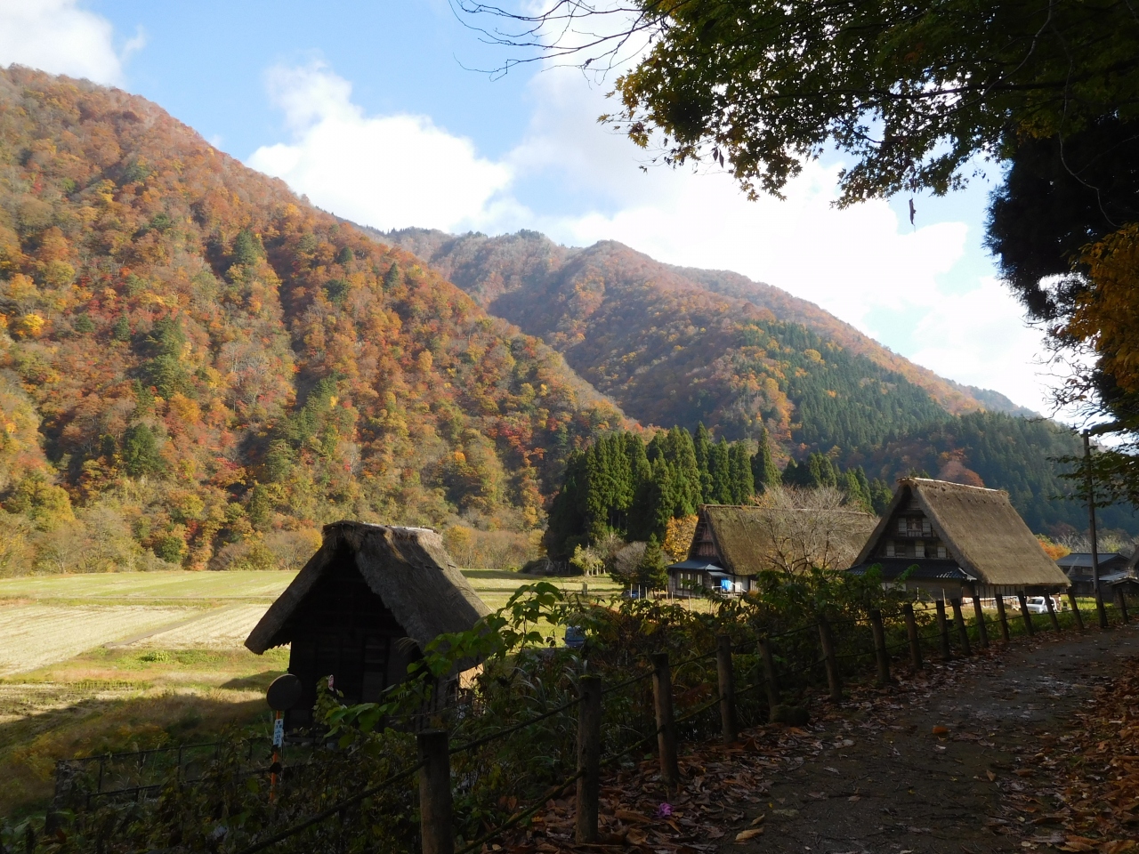 紅葉の時期に初めて白川郷を訪れました。富山県側の「相倉合掌造り集落」と「菅沼合掌造り集落」を見てから、お昼頃、白川郷のメインである「萩町合掌造り集落」到着したのですが、せせらぎ公園駐車場は既に満車になっていたので、庄川の反対側にある「みだしま公園臨時駐車場」に車を停めました。逆にこちら側の駐車場の方が観光のアクセスは良かったと思います。相倉や菅沼の方はこじんまりとした感じの集落だったのですが、やはり萩町は、観光地であり、多くの観光客のいる場所という印象でした。普段の時期であれば、もっと多くの観光客で混雑しているようですが、今年は割とゆっくりと豊かな自然と田園風景を楽しみながら観光をする事が出来て、とても良かったです。