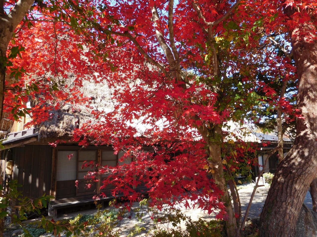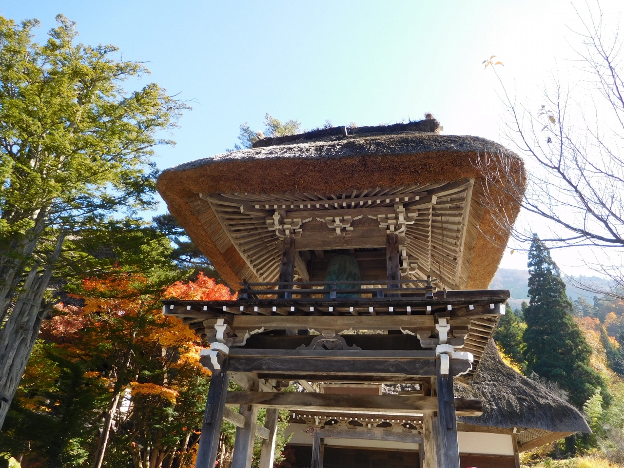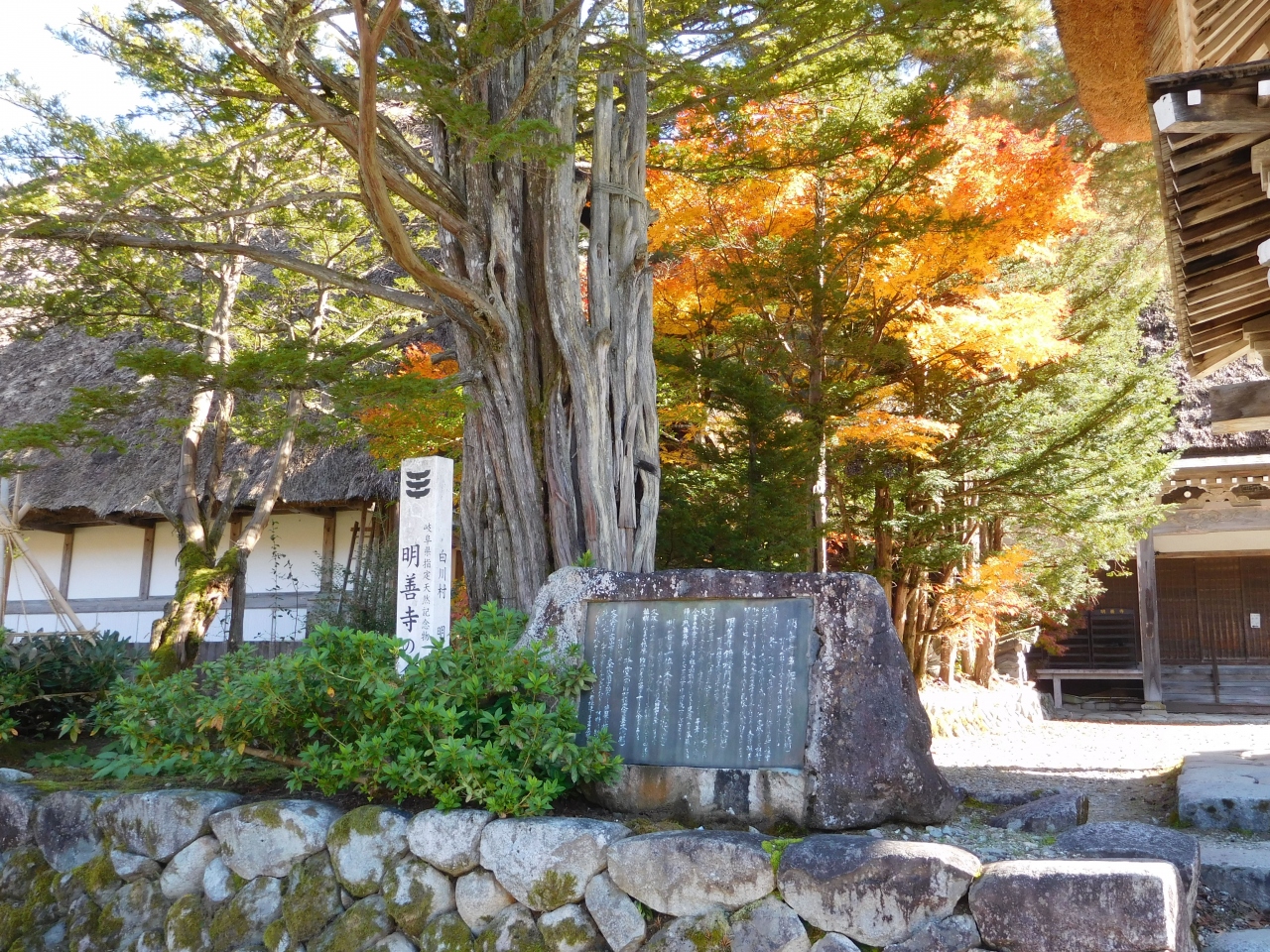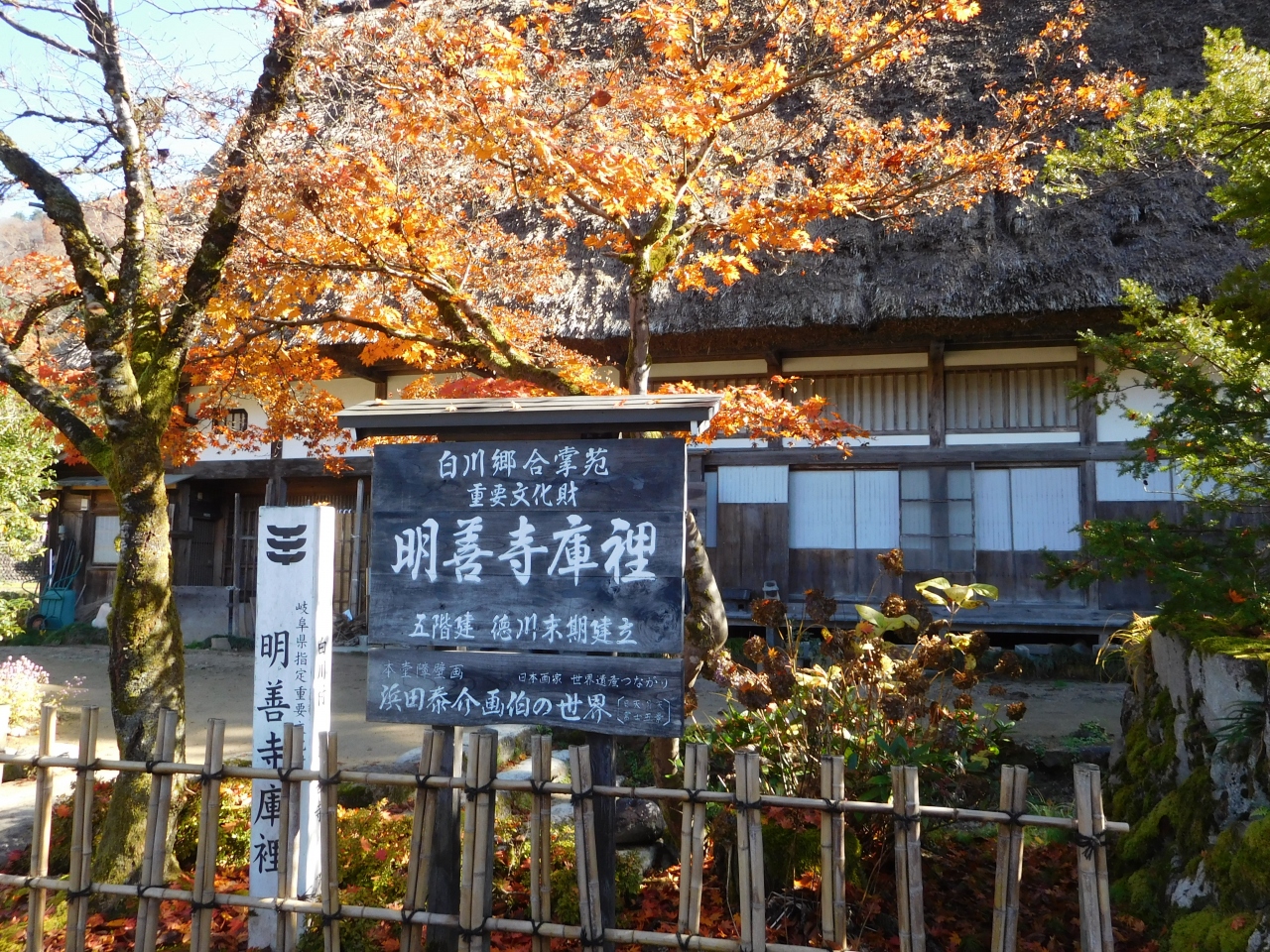 世界遺産に登録された白川郷「萩町合掌造り集落」の少し奥まった場所にある、県指定重要文化財に指定された「明善寺」です。珍しい茅葺きの「鐘楼門」が通り沿いから見え、しかもちょうど綺麗に紅葉している木もあったので、多くの人が写真を撮っていました。白川郷の景色に見事に溶け込んだようなお寺で見応えがありました。