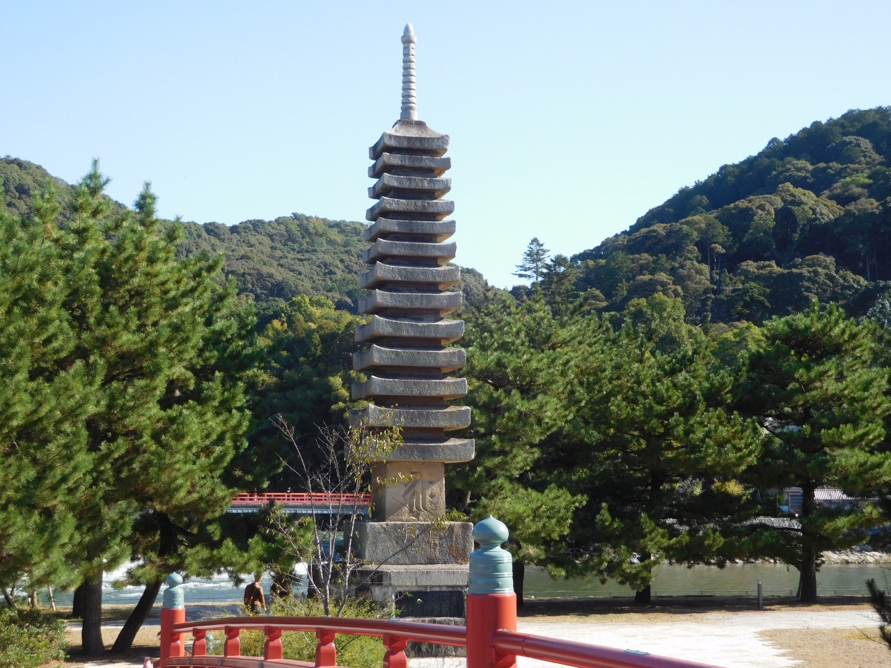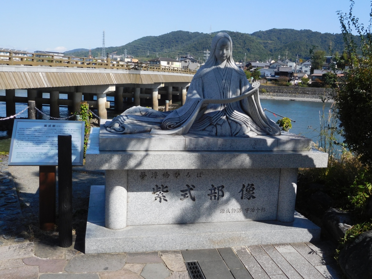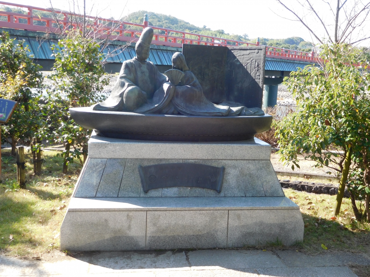 京都 宇治川の中州から、宇治神社や宇治上神社方面へと向かう赤色の朝霧橋を渡ってすぐの場所(ちょうど宇治神社の鳥居の向かい側)にありました。源氏物語「宇治十帖」の「浮舟」と「匂宮」が小舟で宇治川に漕ぎ出す場面をモチーフとした像があり、撮影スポットになっていました。ちょうど宇治川を背景にした場所で、なかなか良かったです。