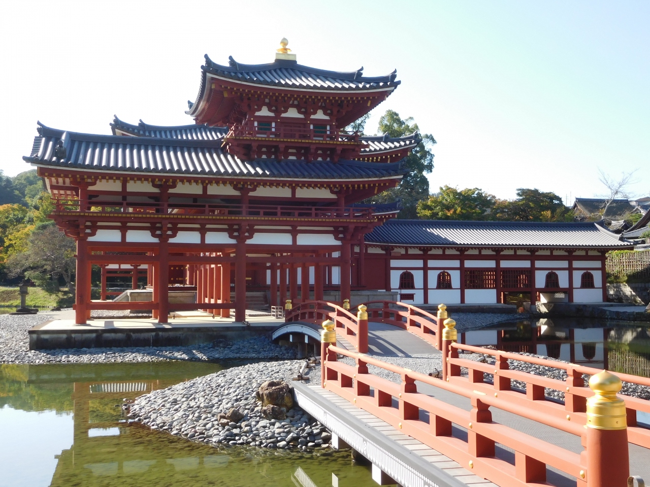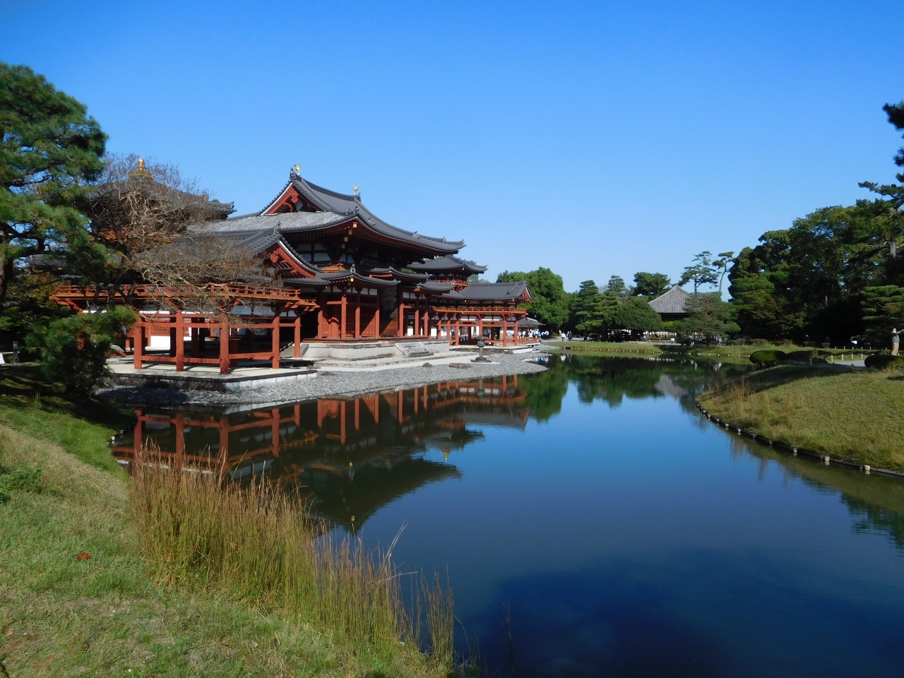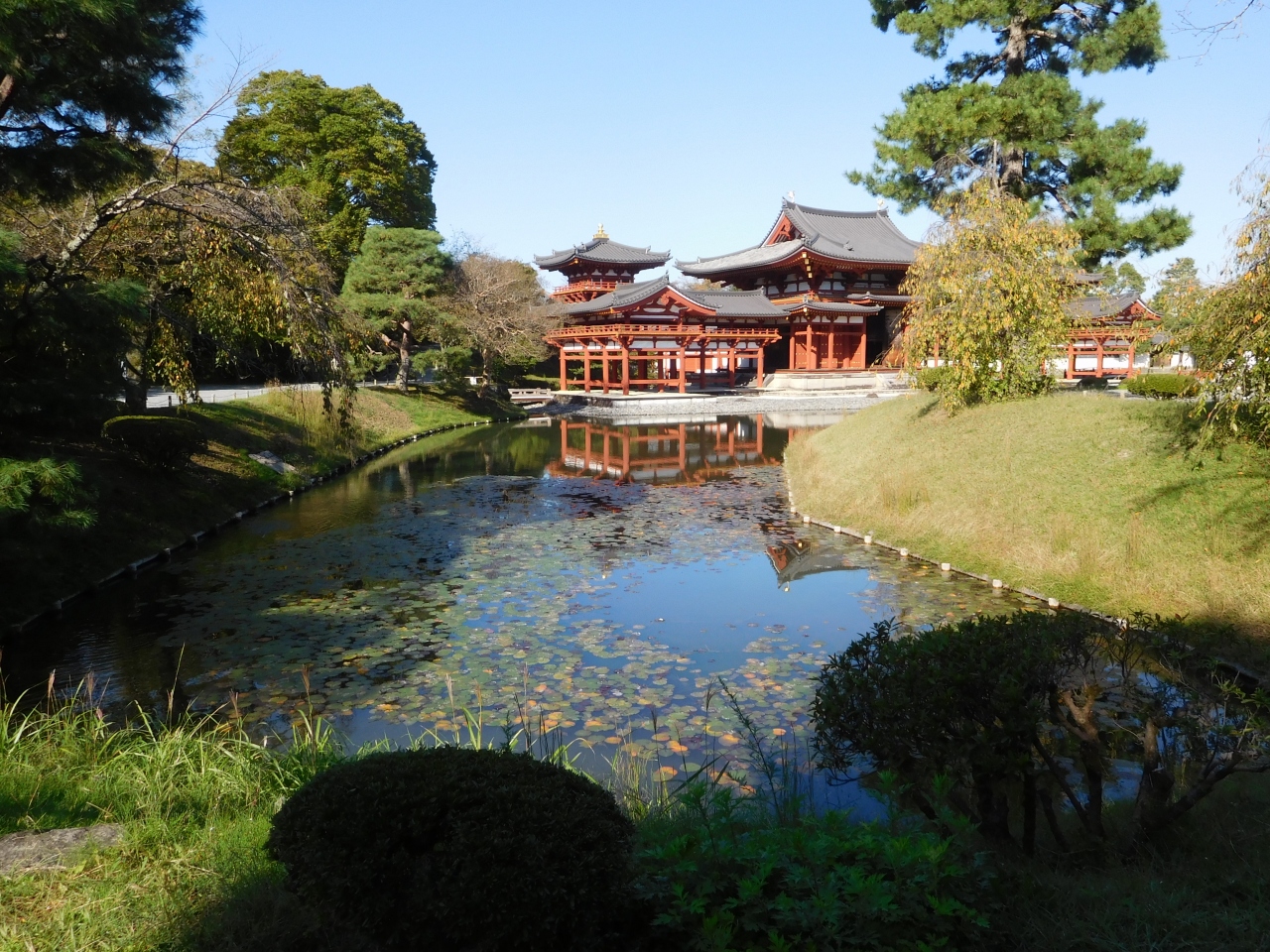 世界遺産に登録され、10円硬貨のデザインになっている「平等院鳳凰堂」。京都駅からは少し足を延ばした観光地になりますが、とても風格のあるデザインの建物で、竜宮城のような、どの角度から眺めてもとても素敵でした。ちょうど修学旅行の学生さん達が来ていて、少し賑やかでした。「鳳凰堂」は拝観料とは別料金になり、人数制限を設けての案内になるので、1時間以上先の案内になると言われ、時間的に厳しいので、今回は諦めました。もう一つの建物「鳳翔館」は別料金無しで見学する事が出来ました。とても見応えがあり、ここまで来て本当に良かったと思いました。