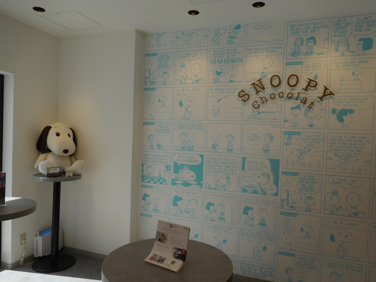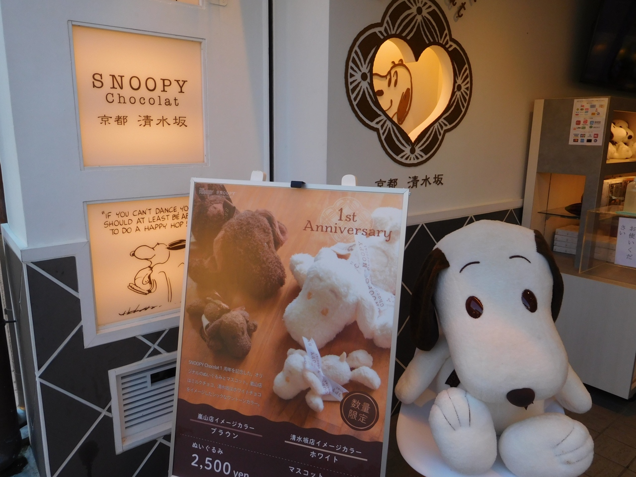 京都の清水坂に、2019年10月にオープンした、スヌーピーの和ショコラのお店です。白色を基調としたとてもおしゃれなデザインのお店で、店内に入ると、スヌーピーの世界が広がっていました。4コマのコミックがチョコレートに描かれた「タブレットショコラ」や、可愛いデザインのチョコレートが沢山あり、他にも、スヌーピーのヌイグルミやグッズなども置いてありました。店内奥には、イートインスペース兼フォトスポットがあり、多くの人が撮影していました。紙袋は有料でしたが、コミックが描かれたスヌーピーのデザインの小分けの袋を付けて頂けました。スヌーピー好きには是非、おススメのお店だと思いました。