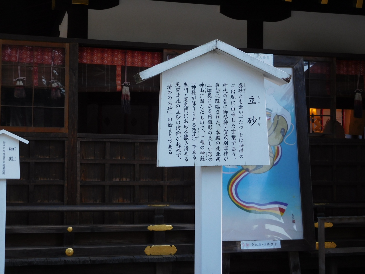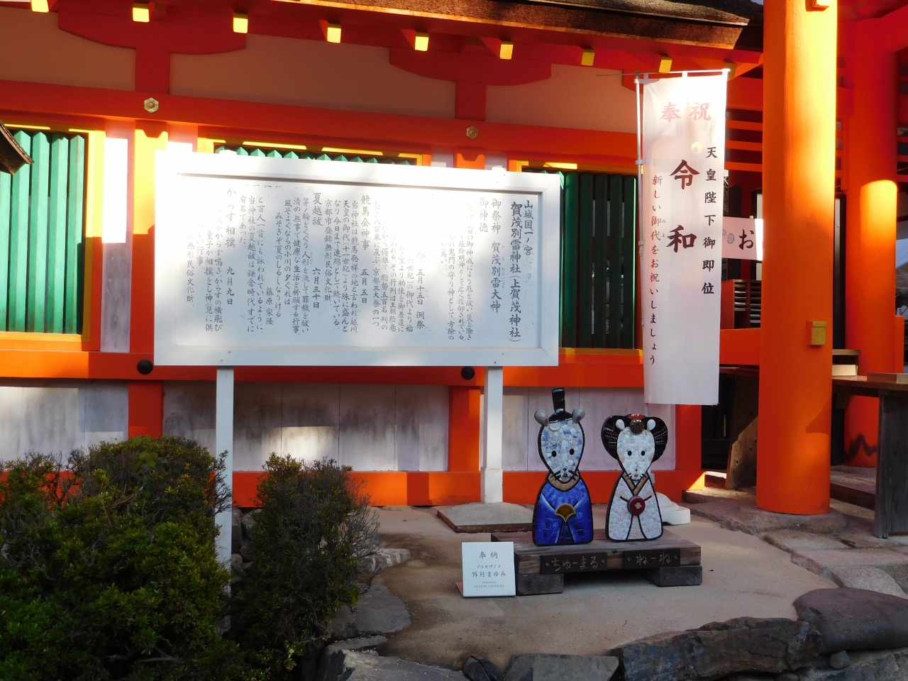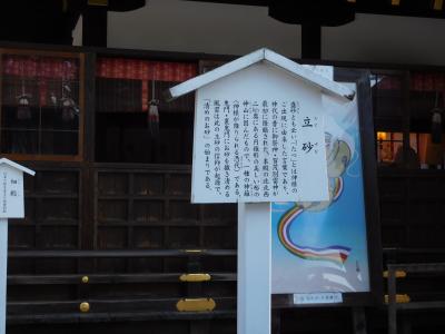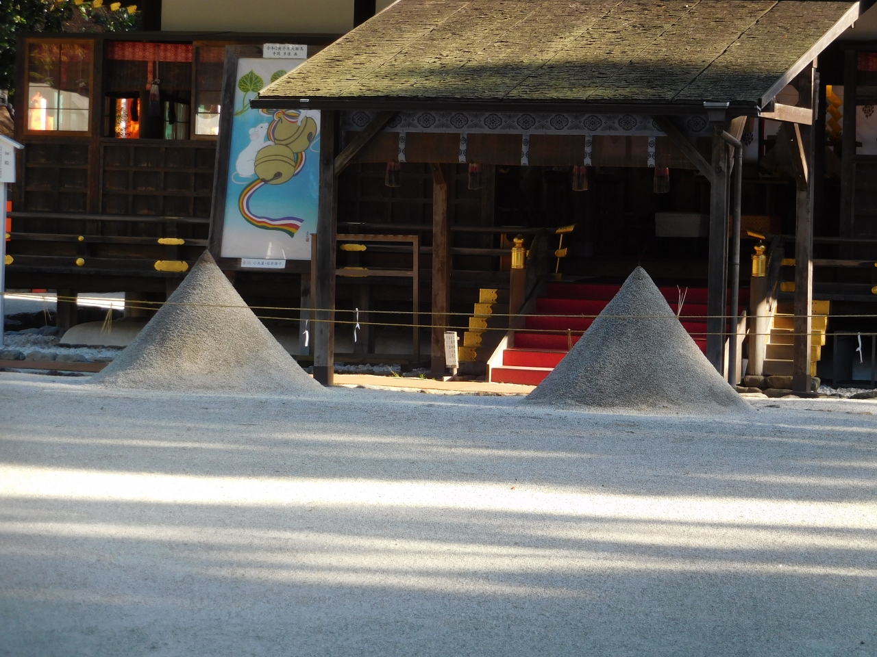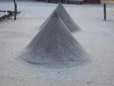 世界遺産の「上賀茂神社」二の鳥居の先にある「細殿」の前に、遠くからでも分かる位の、綺麗な円錐形に大きく盛られた「立砂」です。神様が降り立つ神聖な場所の起源とされていて、凛と張り詰めたような空気感がありました。立て砂の先には、今年の干支であるネズミの絵が奉納されていました。風雨の影響を受けないのかと心配になりますが、とても存在感がありました。