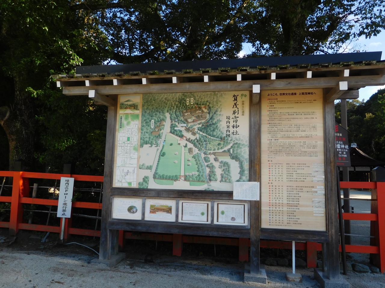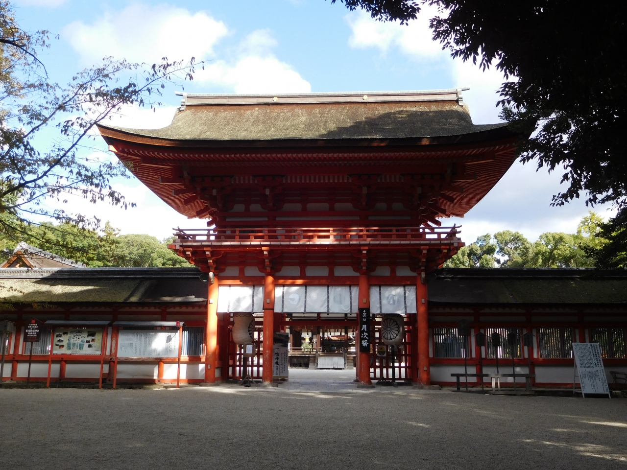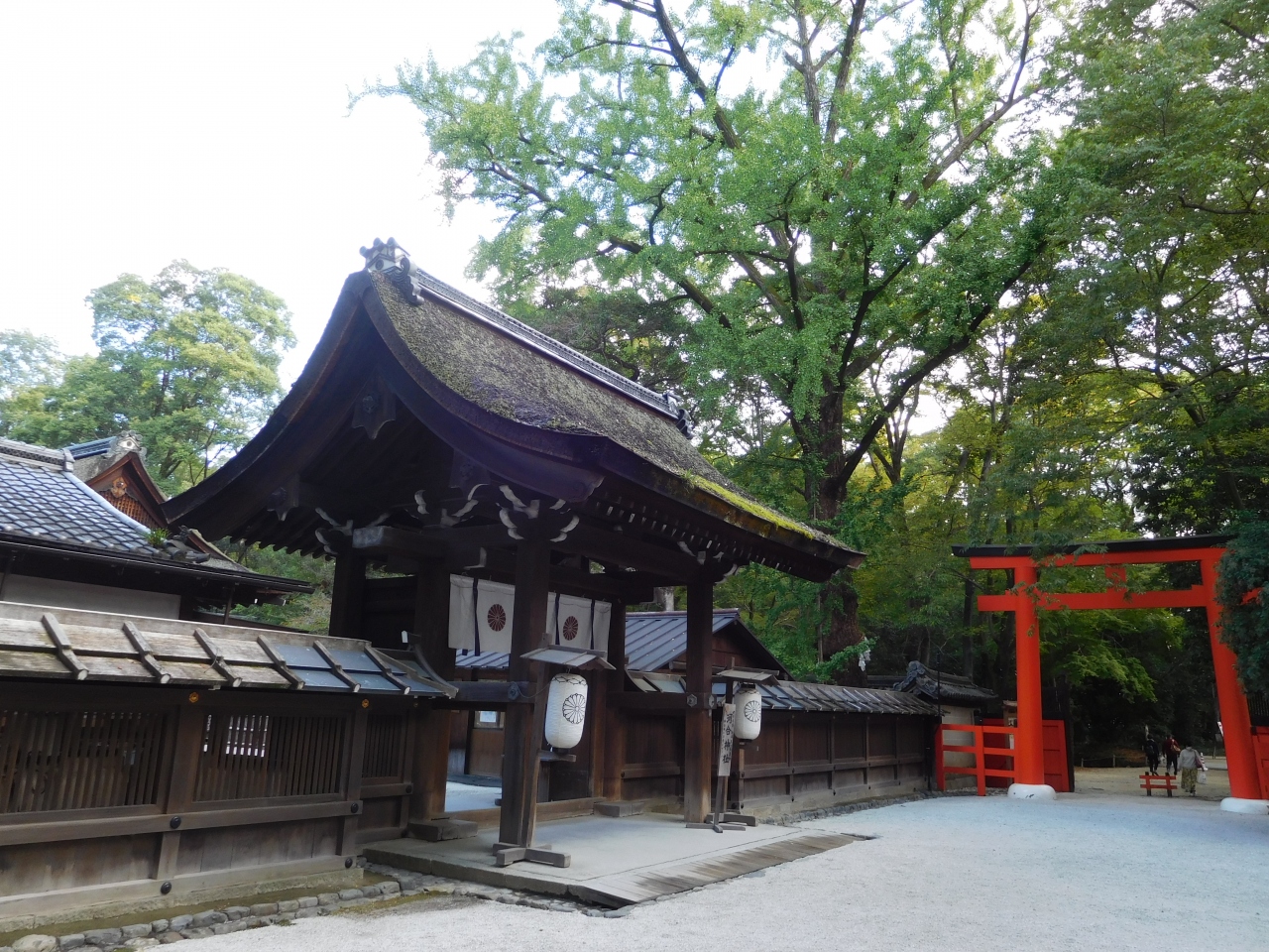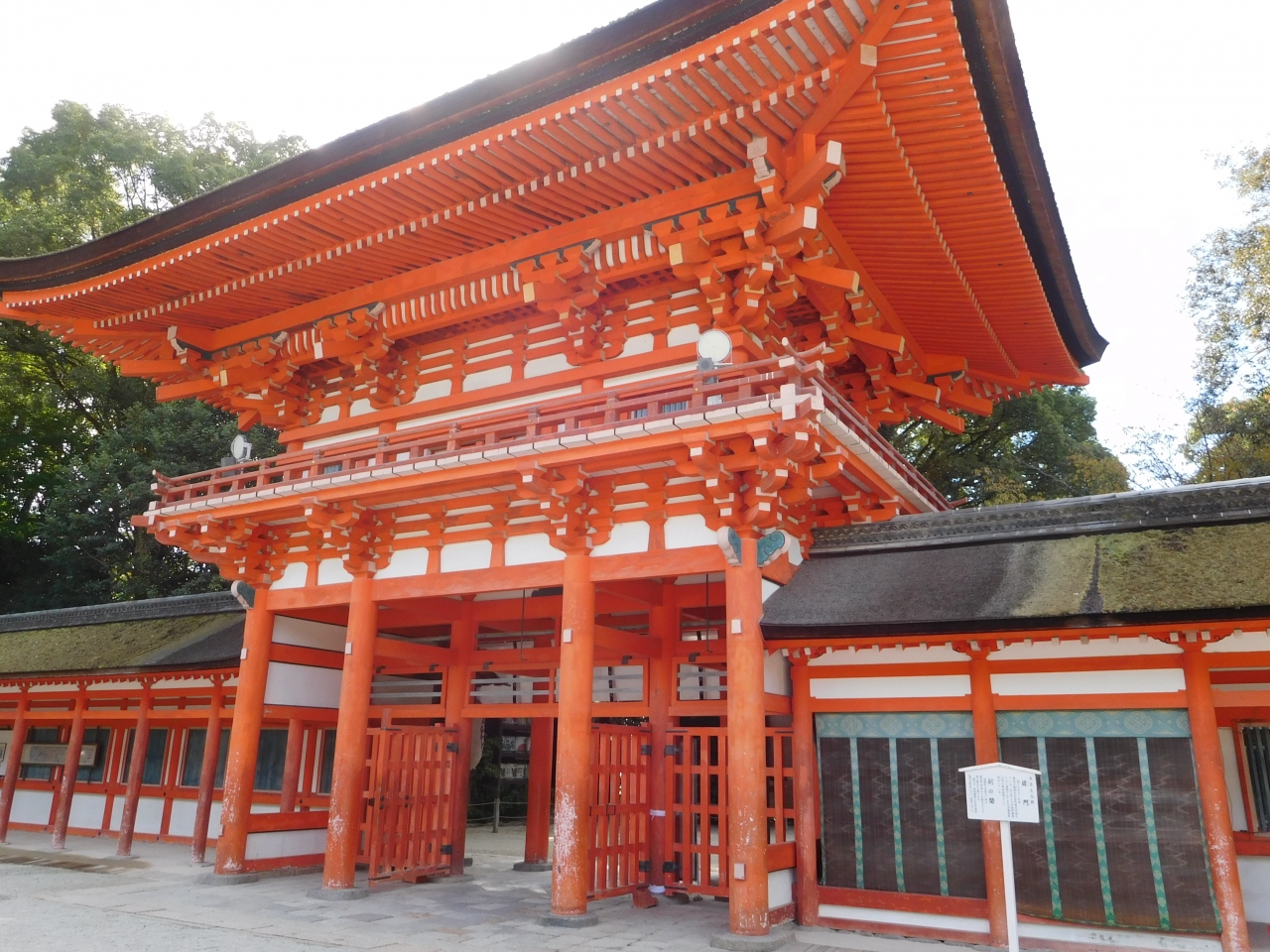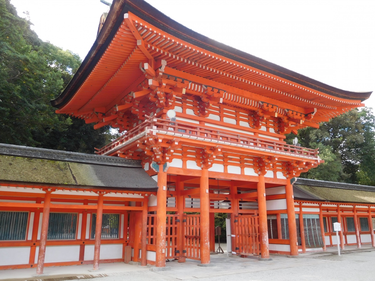 世界遺産「下鴨神社」のシンボル的存在とも言える、とても存在感のある見事な楼門です。重要文化財に指定され、高さ約30メートルもありました。正面から見ると、趣のある落ち着いた朱色の印象で、裏側は、鮮やかでオレンジ色に近い朱色の印象を受けました。