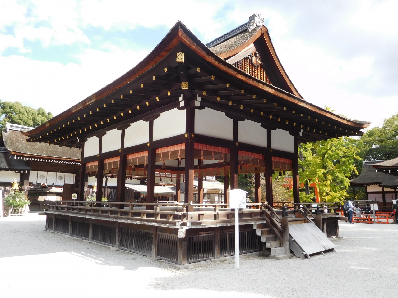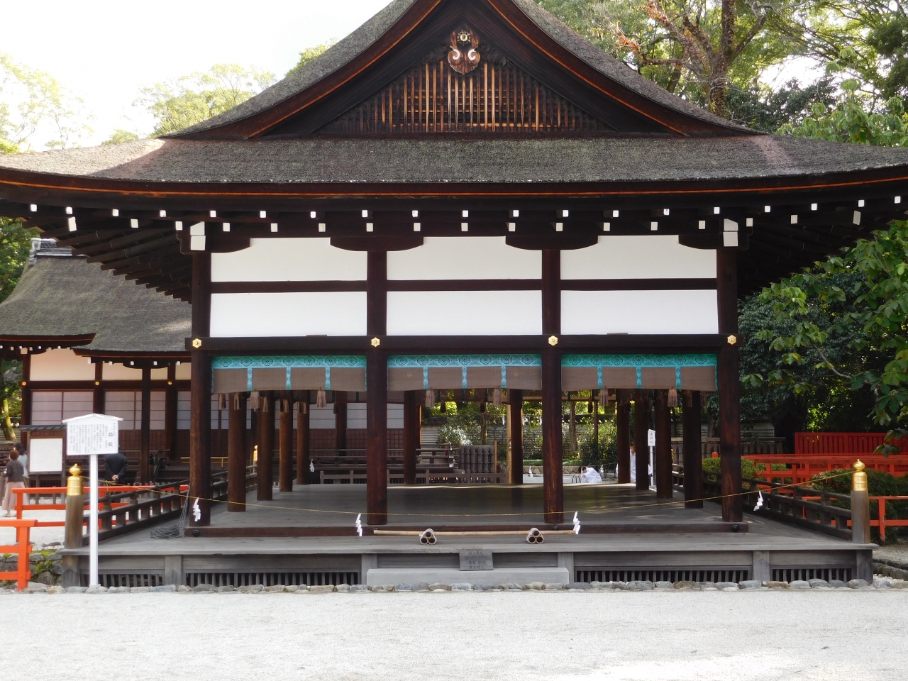 下鴨神社の楼門の正面にあるのが「舞殿」です。鮮やかでまぶしい位の印象の楼門とは対照的に、落ち着いた格式の高い建物という印象でした。晴れ渡って清々しい朝に訪れたので、とても神聖な気持ちで眺める事が出来ました。