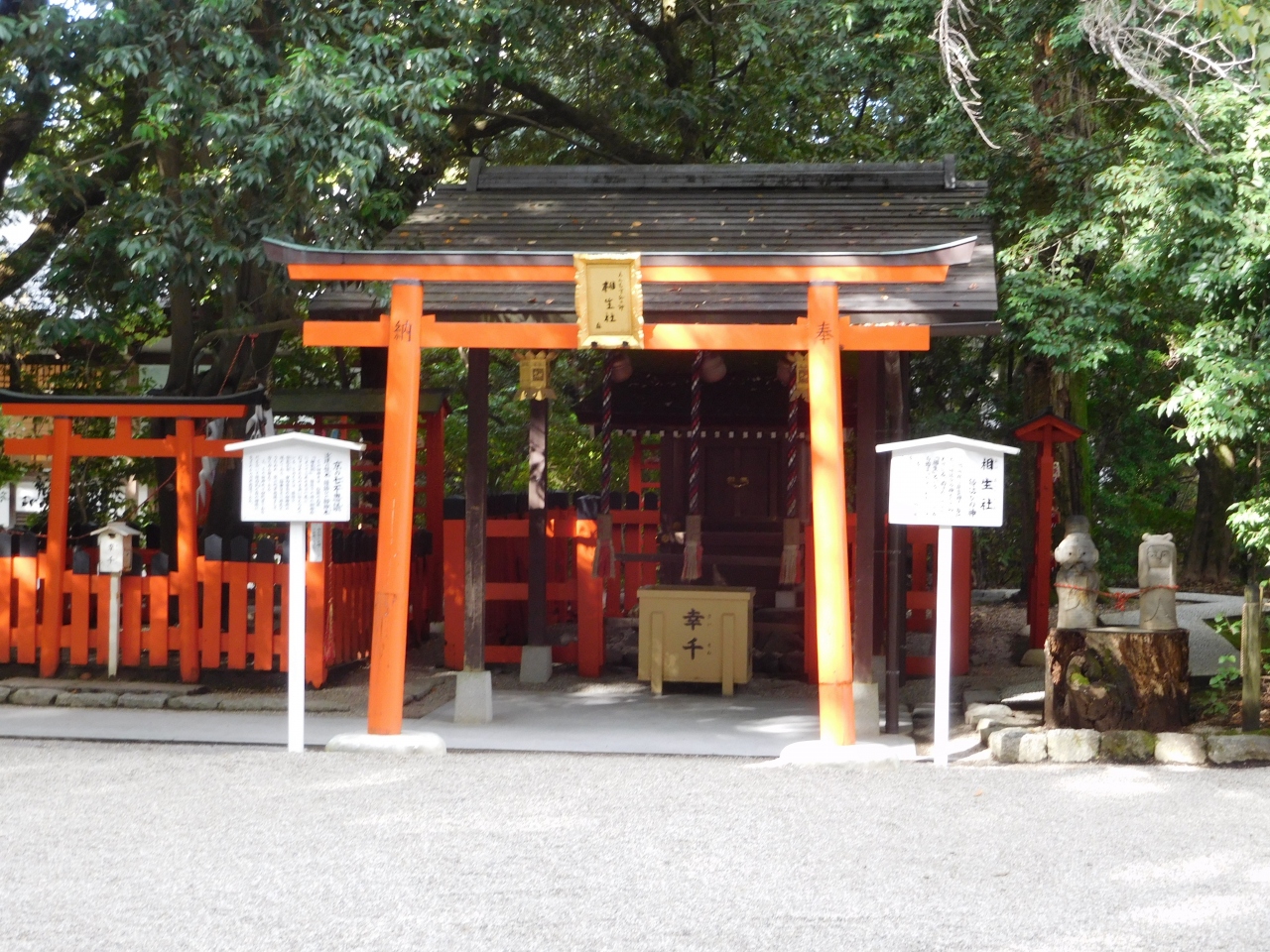 下鴨神社の楼門入口の手前側(左側)に鎮座する、えんむすびのお社です。下鴨神社の末社の一つで、とてもこじんまりとした印象でした。鳥居のすぐ右側には、男女の小さな像があり、赤い紐でしっかりと結ばれていました。後ろには、えんむすびのシンボルである「道理の賢木」があり、とてもパワーが感じられました。