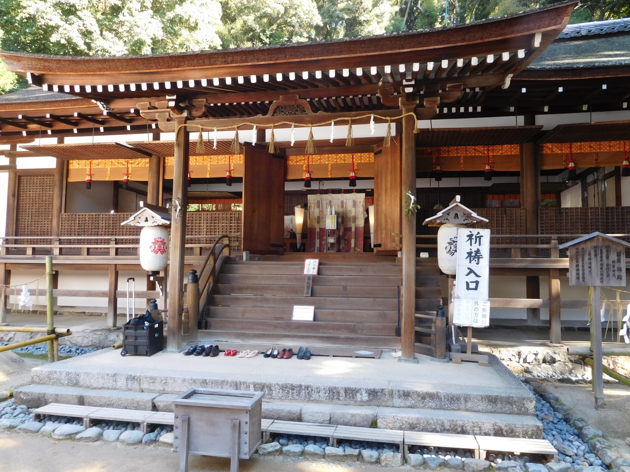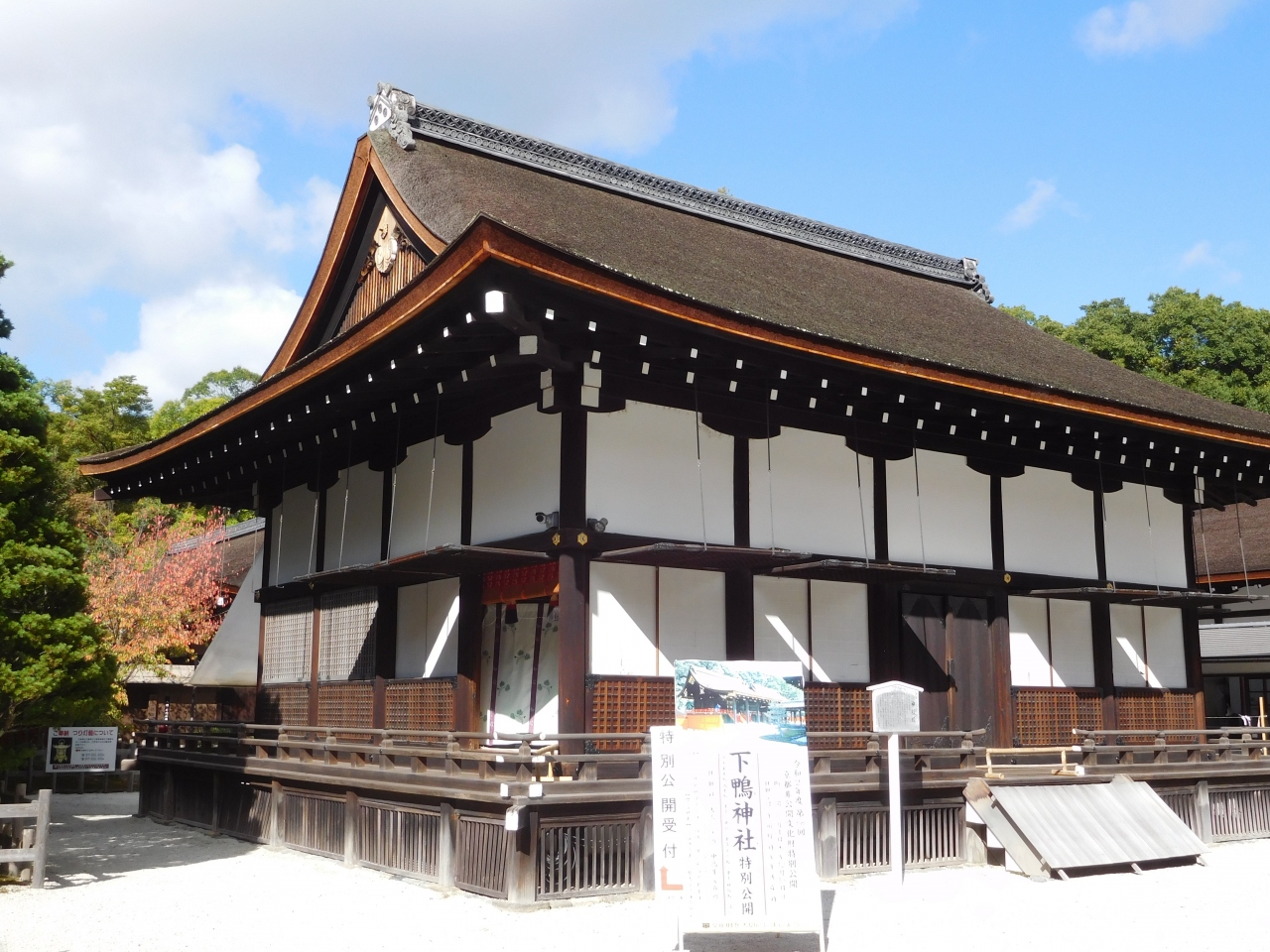 下鴨神社の立派な楼門を抜け、本殿に向かってすぐ右側にあるのが、重要文化財に指定されている「橋殿」で、「御蔭祭」の際に、御神宝を奉安する御殿です。天井が高く、しっかりとした柱で支えられて、頑丈そうな印象がありました。