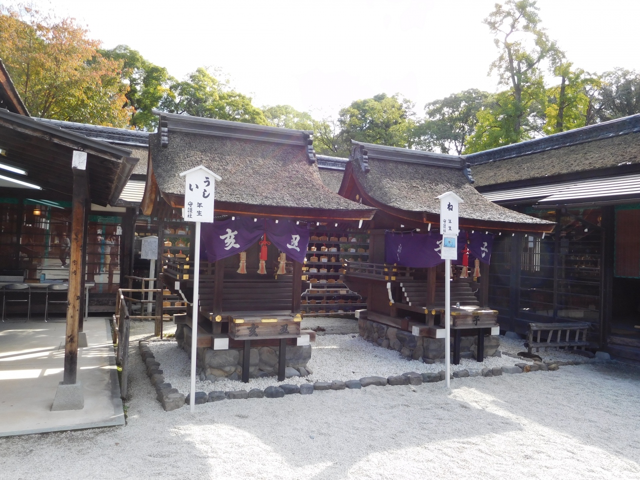 下鴨神社の正式名称は「賀茂御祖神社」で、糺の森と、国宝の本殿2棟・重要文化財の社殿53棟を含めて、世界文化遺産に指定されています。上賀茂神社を参拝した後、バスで到着したので、本殿のある境内に最初に入ってしまいましたが、糺の森を通ってから参拝をすると神社の存在感がより一層感じられるような気がしました。朝早い時間だったので参拝客も割と少なく、とても厳かな雰囲気で参拝する事が出来て良かったです。また、本殿の前には、十二支のお社(言社)があり、十二支それぞれの社があったのが印象的でした。