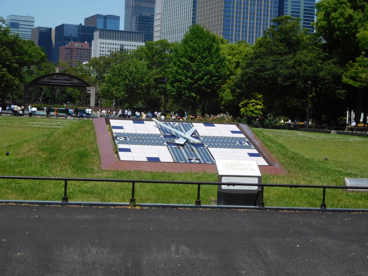 日比谷公園内、日比谷公会堂側の広場に面した「第二花壇」の少し傾斜がつけられた芝生内に大きな「ソーラー時計」が埋め込まれています。白と青を基調とした、さわやかな色の時計で、芝生の緑ととても合っていました。時計の手前には説明書きがありました。大きな時計で時間の確認がしやすくて良かったです。