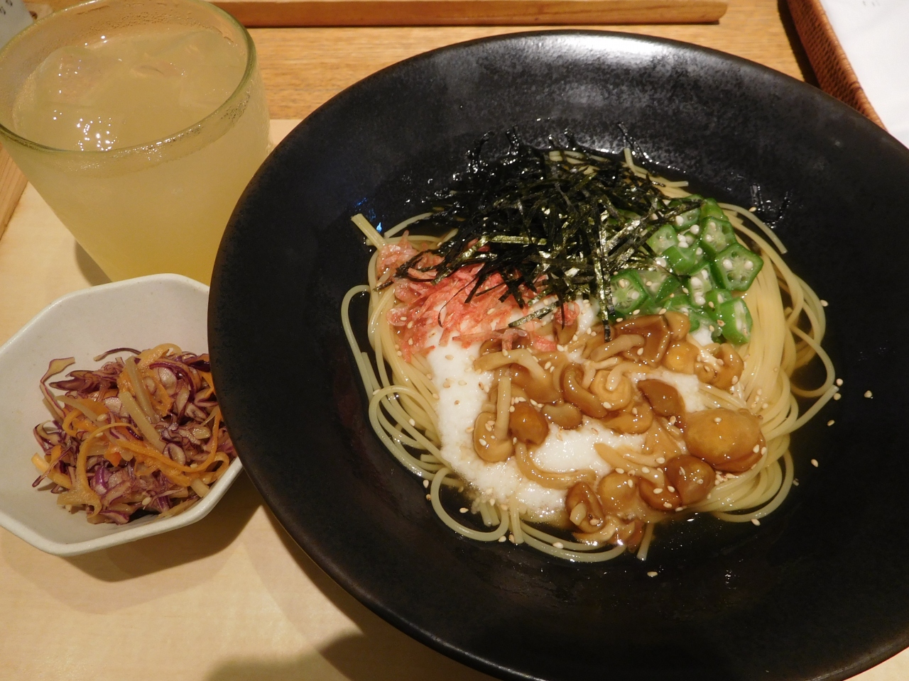 自由が丘にある、おしゃれな2階建ての一軒家「和パスタカフェ」です。チェーン店ですが、各店舗ごとに個性を出しているようでした。2階の奥の方には、ゆったりとくつろげるソファー席もありました。ランチタイムのパスタとセットメニューを注文しました。パスタ、小鉢(4種類の中から1品)、デザート(4種類の豆乳プリンから1つ)、ドリンクがついて、とてもお得感があって美味しかったです。