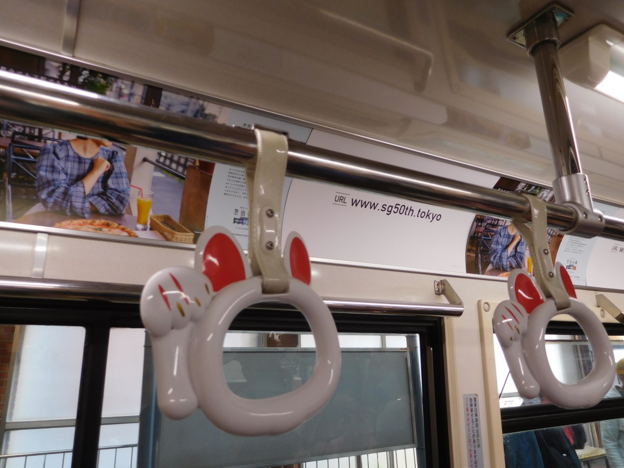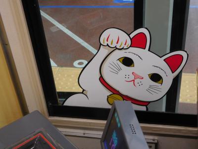三軒茶屋駅と下高井戸駅間を2両編成の電車で走る、とてもローカル感のある路線です。世田谷線50周年記念で復活した、新「幸福の招き猫電車」に乗車した所、ちょうど観光ガイド電車で運行していたので、沿線の耳寄りな情報なども聞けて、とても良かったです。途中駅から乗車する際は、先頭か一番後ろ側からの乗車となり、降りる際は、ICカードのタッチは不要でした。車内のつり革がまねき猫の手だったり、床にはネコの足跡が描かれていたり、とても特別感があって、楽しめました。