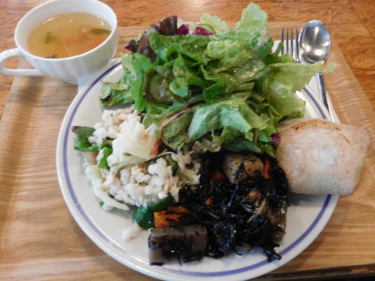 黒を基調としたシックな外観のベルギービールのお店ですが、ランチタイムはカジュアルな雰囲気で、おしゃれなカフェランチが頂けます。カウンター横のボードに、今週のメニューなどが書かれているので、それを見て、カウンターで先に注文・会計をして、番号札をもらって、自分で席を選んで待つスタイルでした。今週のデリランチを注文すると、野菜がたっぷり盛られたプレートが出てきて、なかなか美味しかったです。