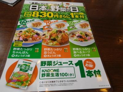 お手頃な値段で、野菜たっぷりのメニューが頂けるので重宝するお店です。中原街道沿いにあり、お店の前と後ろ側にも駐車場が完備しているので、ランチで利用しました。カウンター席、2人テーブル席、ボックス席があり、厨房の様子がよく見えるような、かなりコンパクトなお店でした。訪れた日はちょうど「日本の野菜の日」で、野菜たっぷりのメニューに、餃子3個と給食用のミニサイズの野菜生活のジュースパックがついて来ました。野菜がたっぷりで、普通サイズでもかなりボリューム感があって、美味しかったです。