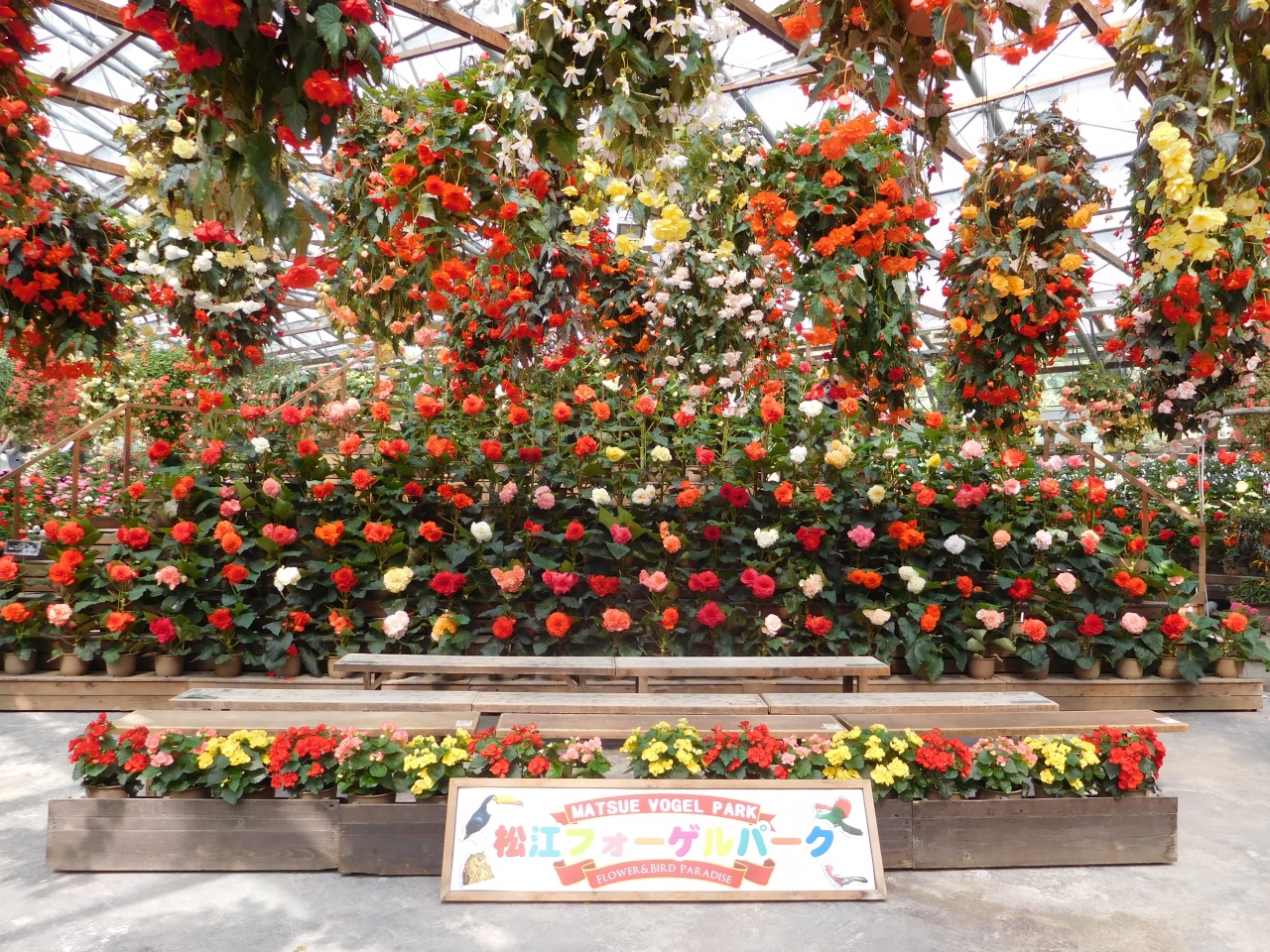 宍道湖の湖畔にある丘陵地を利用して造られた、「花と鳥のテーマパーク」です。自然豊かな場所にあり、各展示場(温室)への移動するのに距離が離れていますが、きちんとバリアフリー対応になっていました。センターハウスは、室内全体が満開のお花で囲まれ、すごく綺麗でした。また、パラダイスホール(ふれあい温室)では、オニオオハシやエボシ鳥と触れ合う事が出来たり、ペンギンの散歩を見る事もでき、すごく楽しかったです。満開のお花の下で頂く、ランチバイキングもとても美味しかったです。数年前に訪れた時よりもリニューアルした箇所もあり、ますます魅力的な場所になっていました。家族でゆっくり楽しめる場所です。