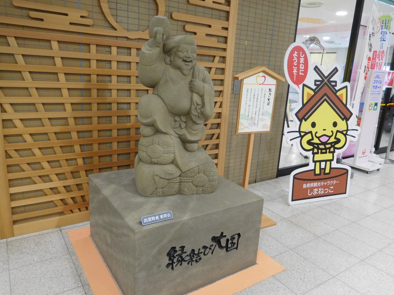 JAL便で羽田からの往復で利用しました。とてもコンパクトな空港ですが、出雲"縁結び"空港という名前の通り、縁結びに関するディスプレイが多くありました。到着ゲートを通る際も、天井に"雲"が沢山描かれていました。鳥取県の境港市へは車で1時間ほどで行く事が出来るので、島根県と鳥取県の観光拠点としても利用出来て良かったです。