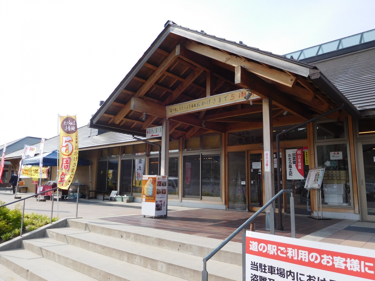 かつて栄えた「たたら製鉄」から名付けられた道の駅で、5周年を迎えた記念の看板やのぼりがありました。木の温もり感が感じられる造りになっていて、地元の新鮮な野菜や、手作りの加工品、お弁当などが並び、他にも、軽食のレストランや、たまごのデザートのお店などがありました。雲南吉田ICのすぐ近くにあるので、高速に乗る前に立ち寄って買い物と休憩をする事が出来て便利でした。