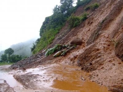バンビエンからルアンプラバンに行く途中13号線山中で、地滑りが・・・。