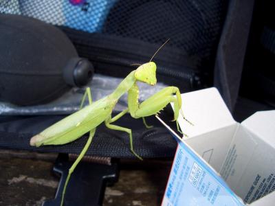館内のテラスで休憩ながらこのカマキリはひっそりと僕らのかばんの上に来た...