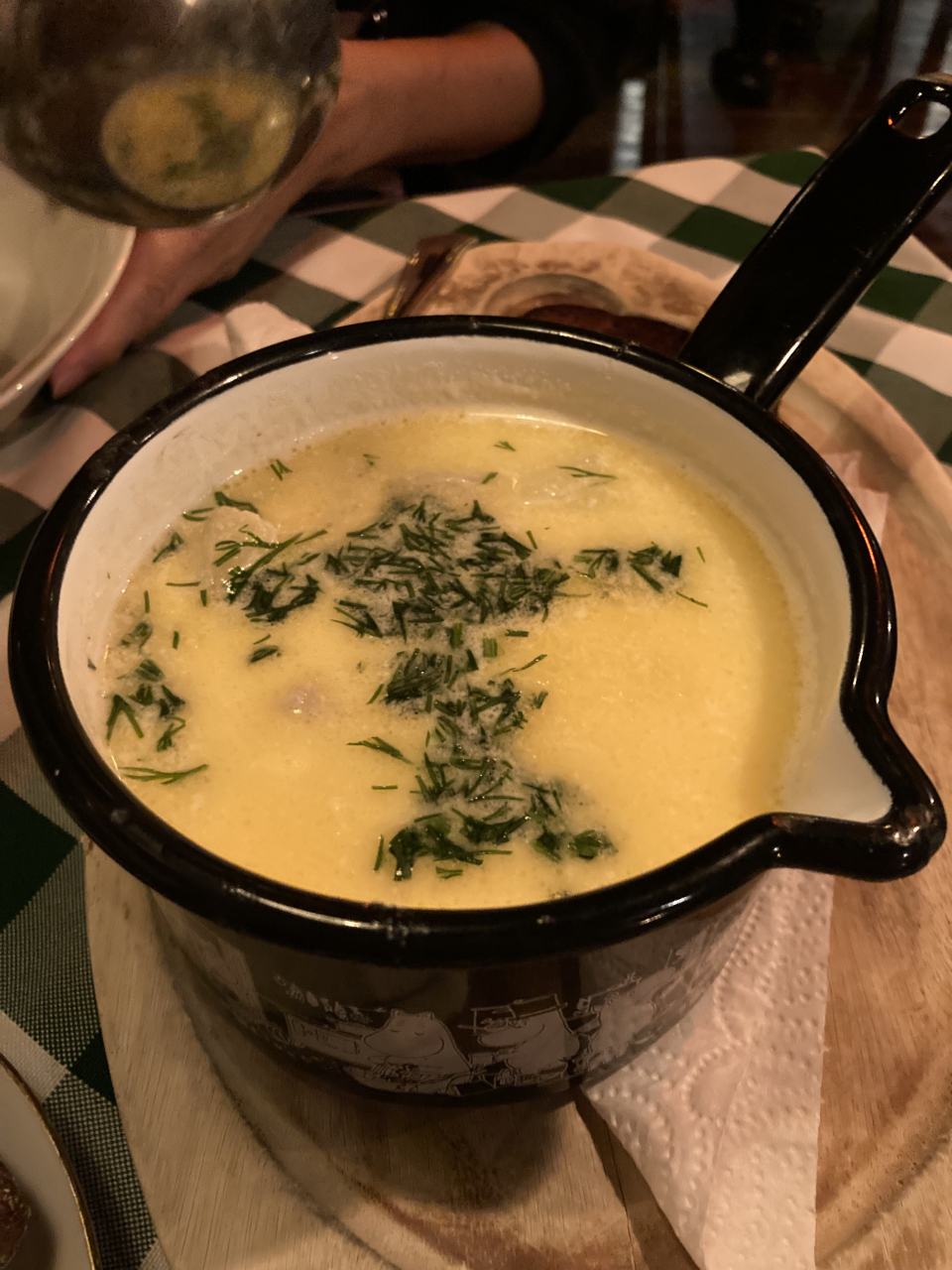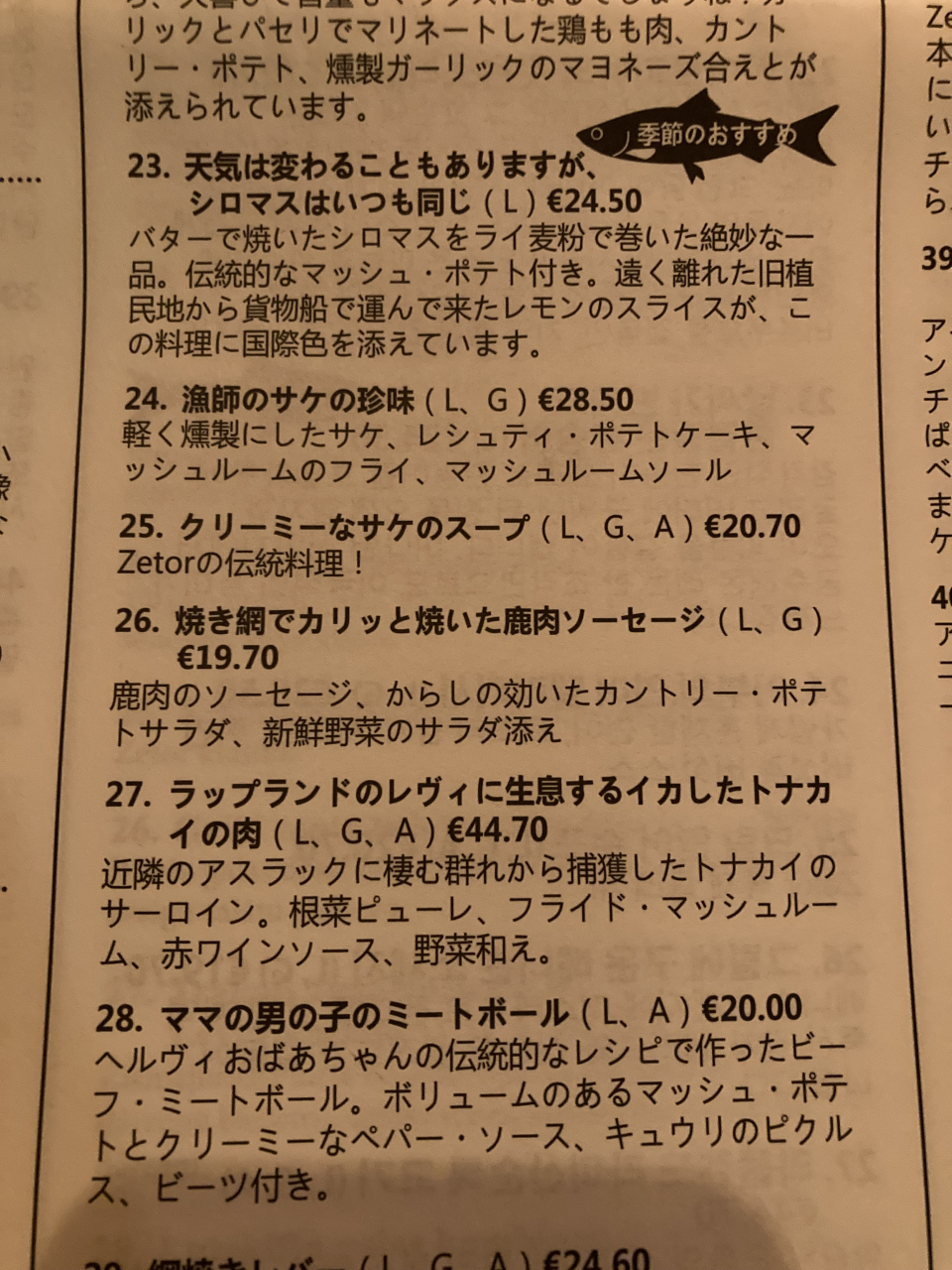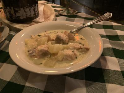 サーモンスープはとてもおいしかったですのですが、白マスの揚げ物は絶品です。お勧めします。- 旅行時期