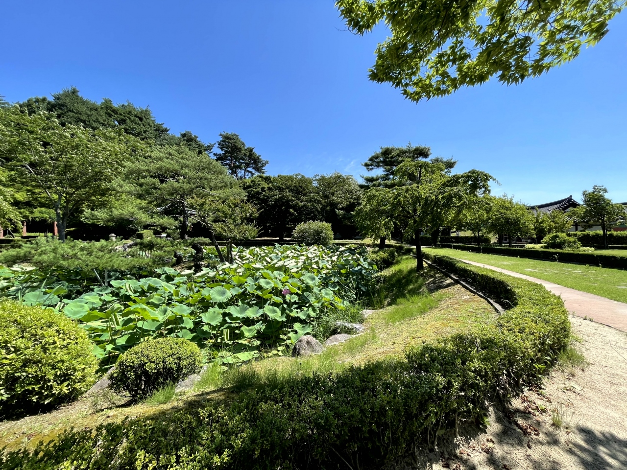 蓮の葉が池にたくさん生えていて、それはそれで綺麗でしたが、蓮の花が咲いている頃に行きたかった。