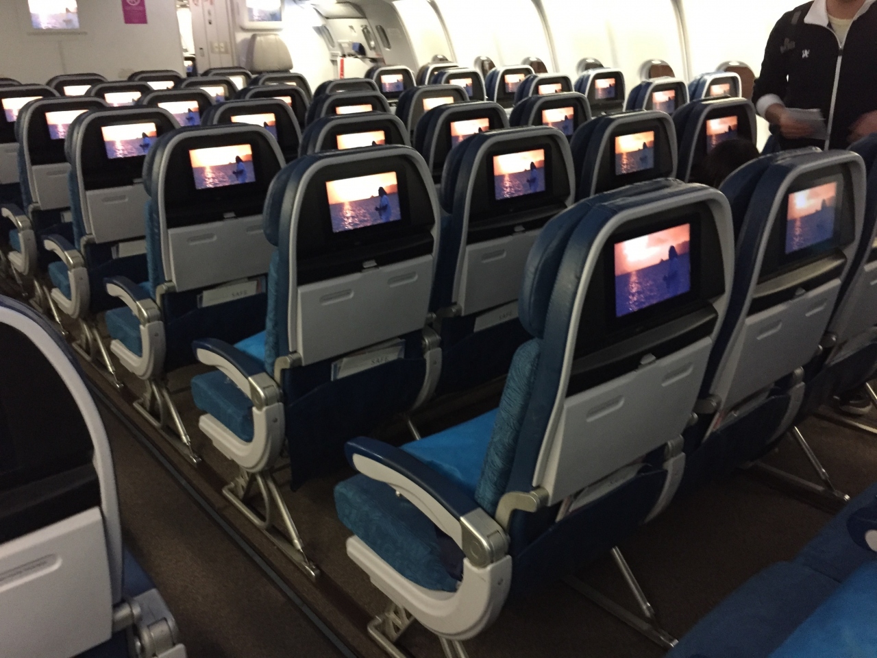 機内に入った瞬間から、客室乗務員の方が笑顔で案内してくださりハワイの音楽が流れていました。