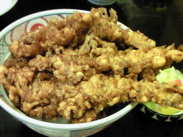 2階の畳の部屋に通されて、さらに待ち、ようやくお待ちかねの海老天丼登場!さすがに人気店だけあって、丼からはみ出るほどのボリュームある海老、ごま油の豊かな風味と、満足感を味わえる天丼でした。