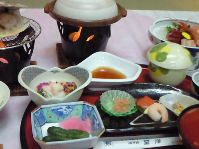 料理は、海辺の街らしく、夕食にお刺身やホタテの焼き物が出され、とても美味しかったです。