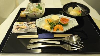ビジネスクラスで快適な空の旅です!機内食では和食を選ぶことが多いです。