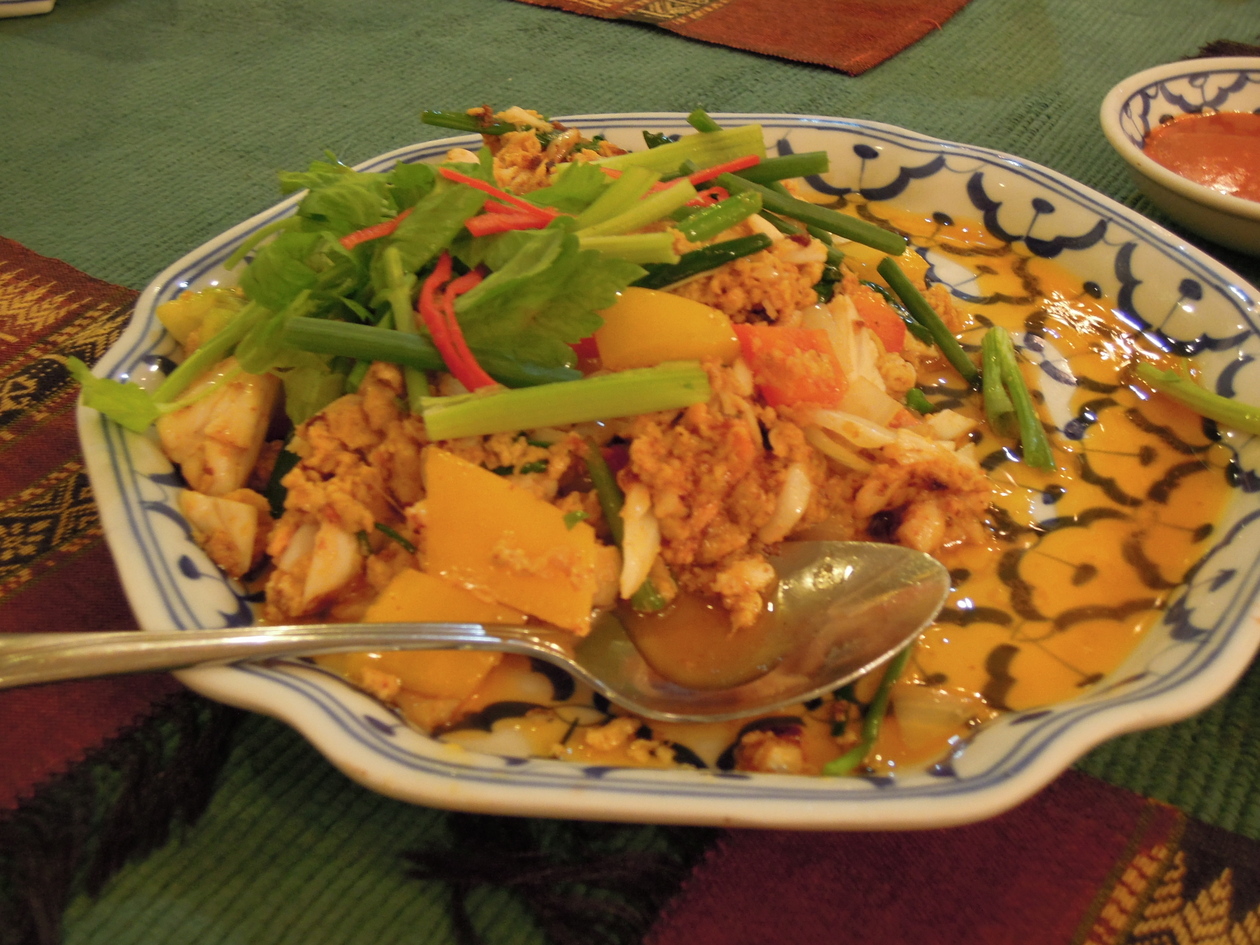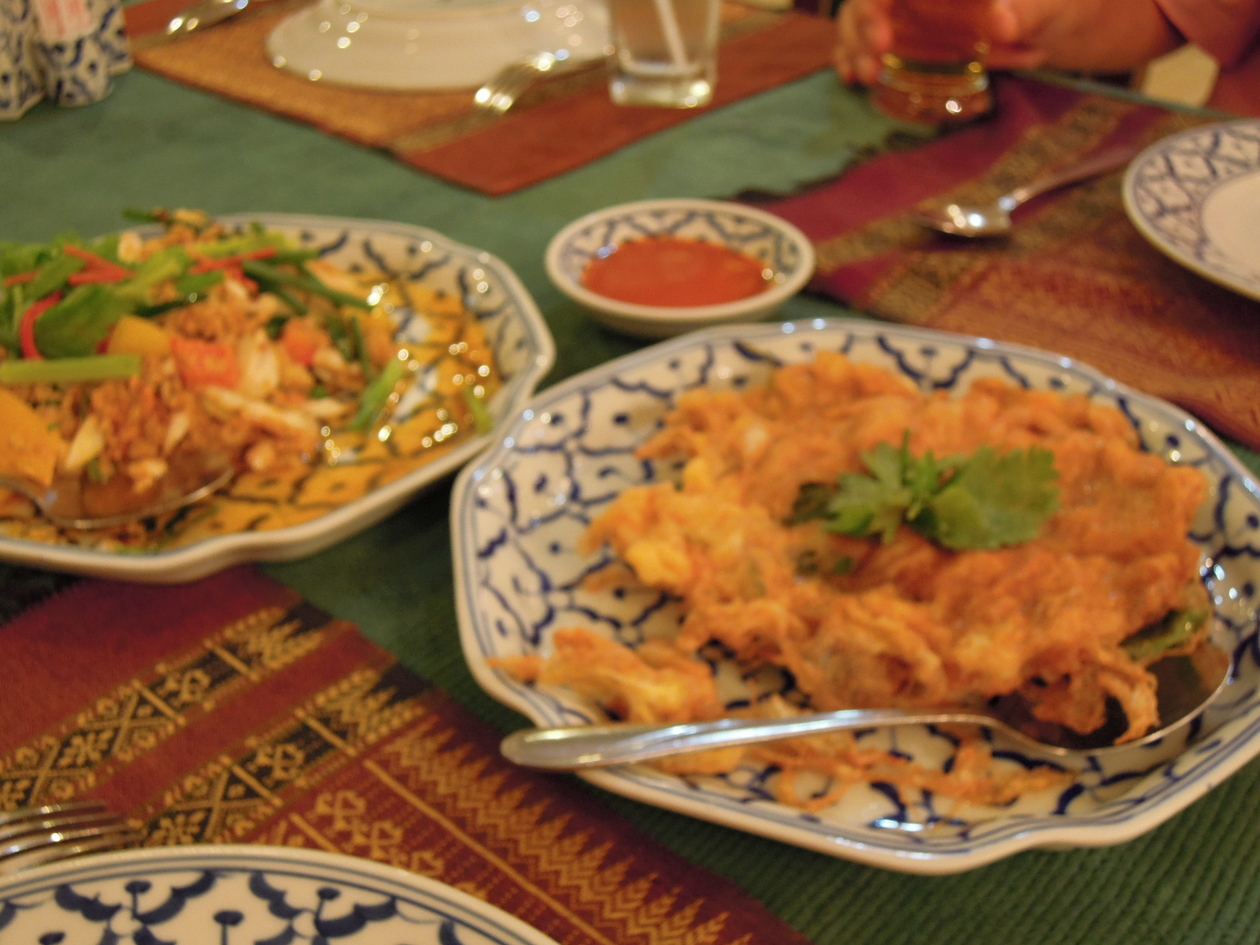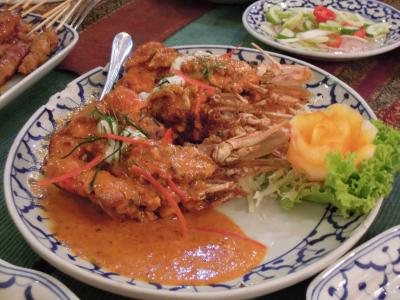 お料理はどれもおいしかったです。地方のパンチの効いた辛いだけの味付けではなく、上品だけどきちっと辛く複雑な味わい。サテは炭火の香りがよく、プーパッポンカレーはむき身の蟹が沢山入って脂っこくないものです。一番のおすすめはレッドカレーソースがかかったエビのグリル。5品+アイスクリームX3+ドリンクを頼んで2700Bでしたが、そのうちエビのグリルが1700Bぐらいでしたので、その他のメニューはそれほど高い店ではありません。