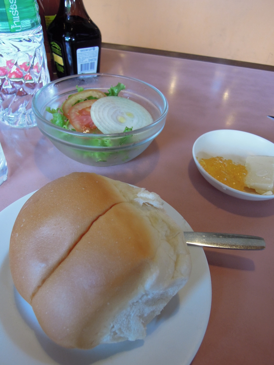 そしてパンがまたおいしい。ラッタナコーシン島で有名なモンノムソッドのパンとジャムみたい。パンはふわふわで、ジャムはファンタオレンジのゼリーといった感じです。